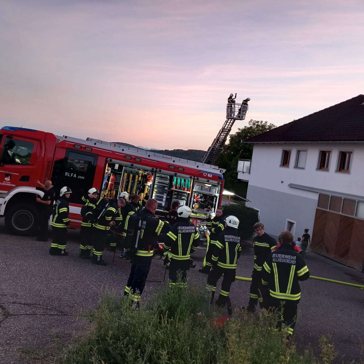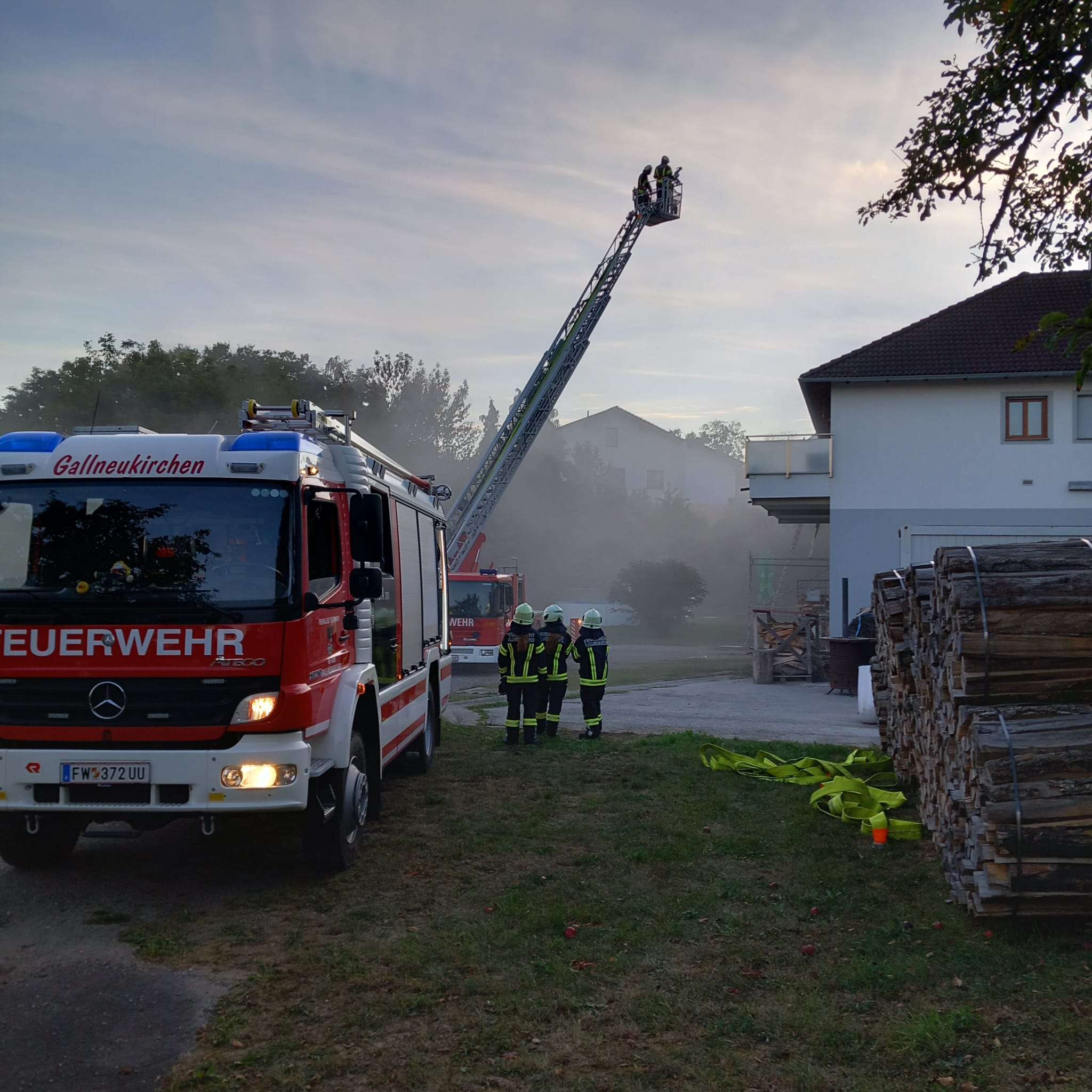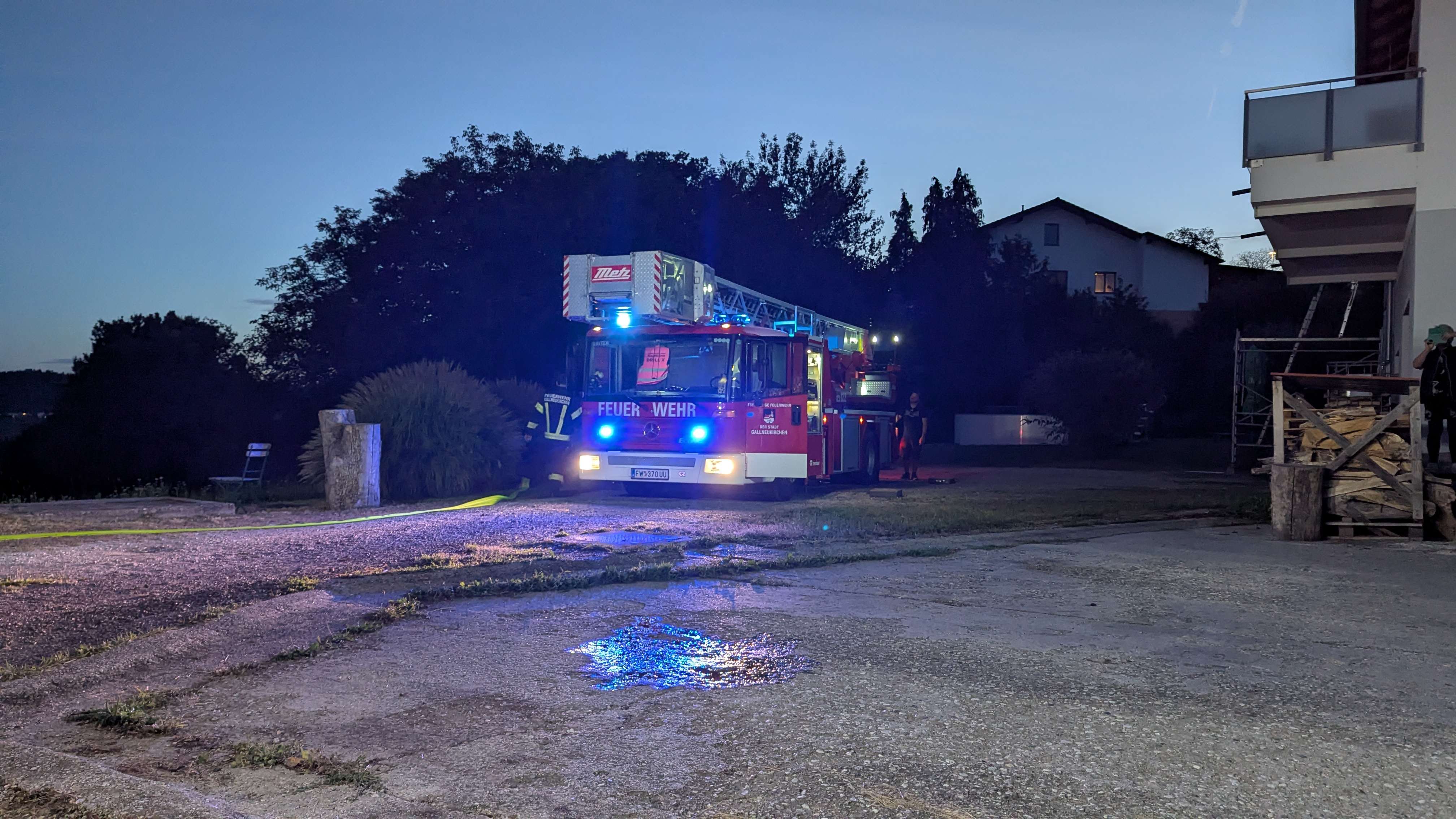 Zeitgleich wurde über die Drehleiter das benachbarte Wohnhaus geschützt und die Wasserversorgung hergestellt.