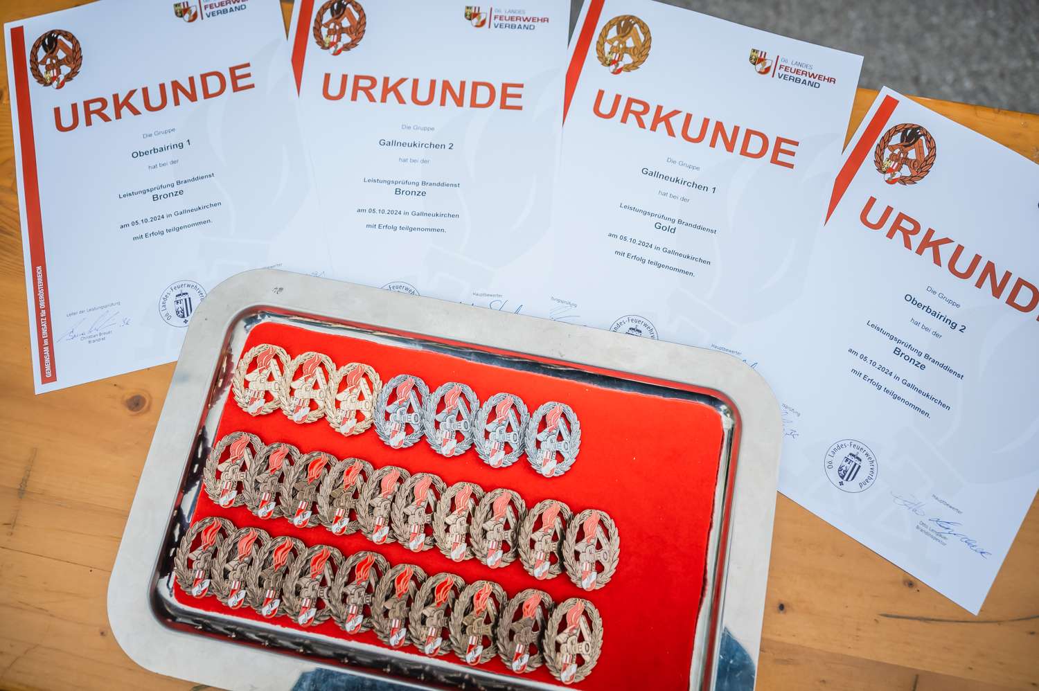 Nach intensiver Vorbereitung traten die Kameradinnen und Kameraden der Freiwilligen Feuerwehren Gallneukirchen und Oberbairing zur Branddienstleistungsprüfung an. Alle vier Gruppen meisterten die Prüfung erfolgreich und durften ein Abzeichen in der jeweiligen Stufe entgegennehmen.
