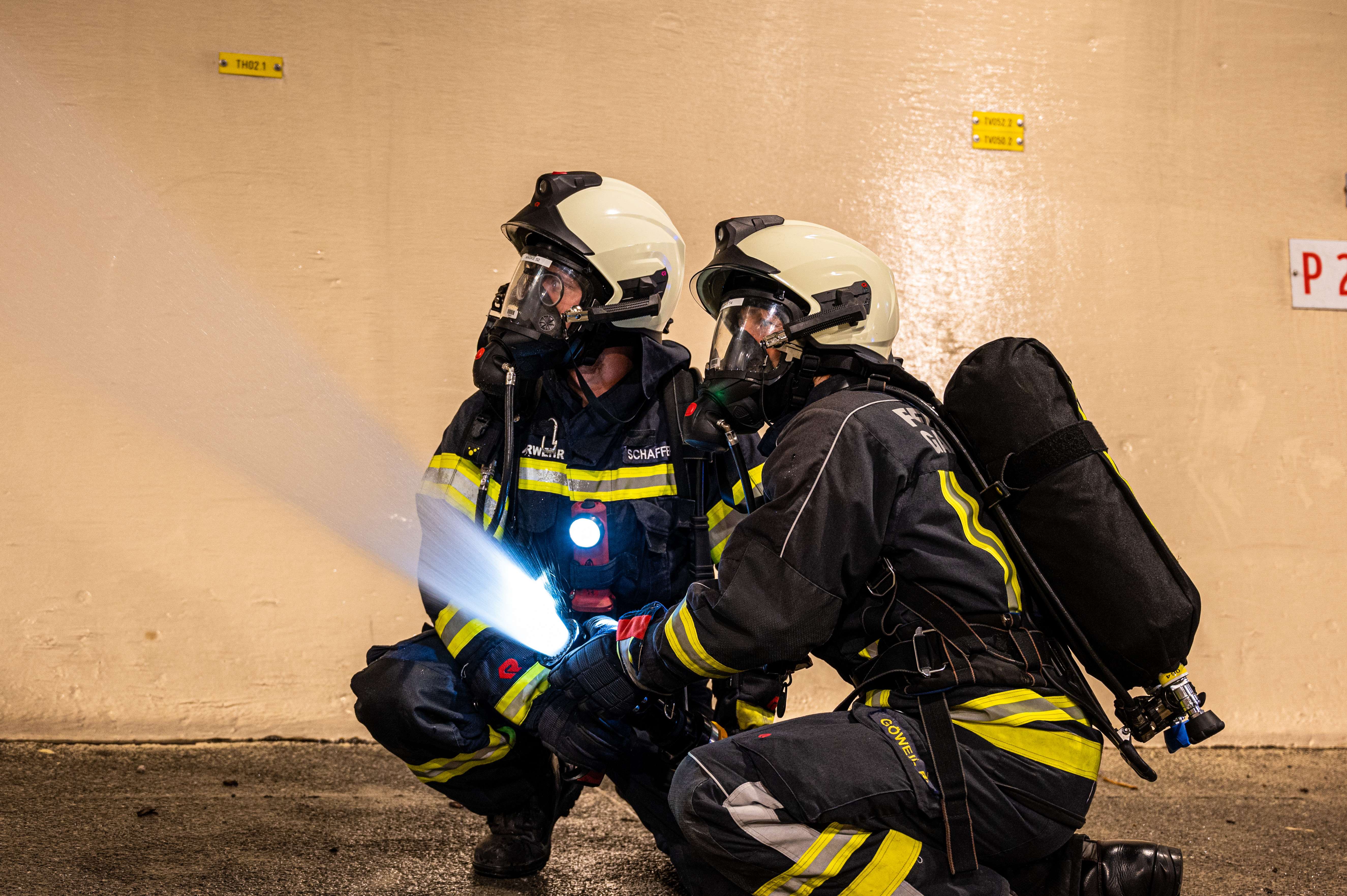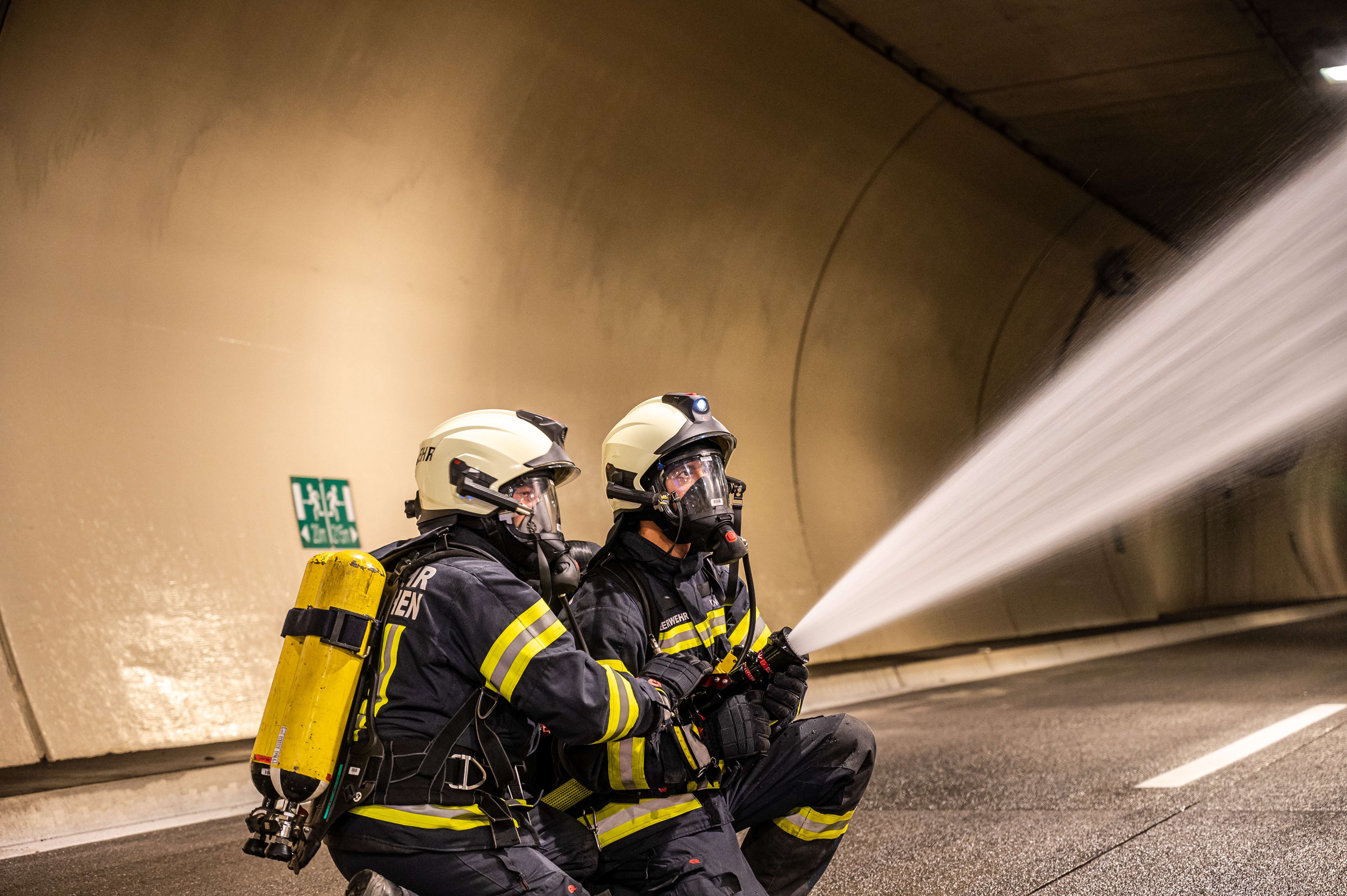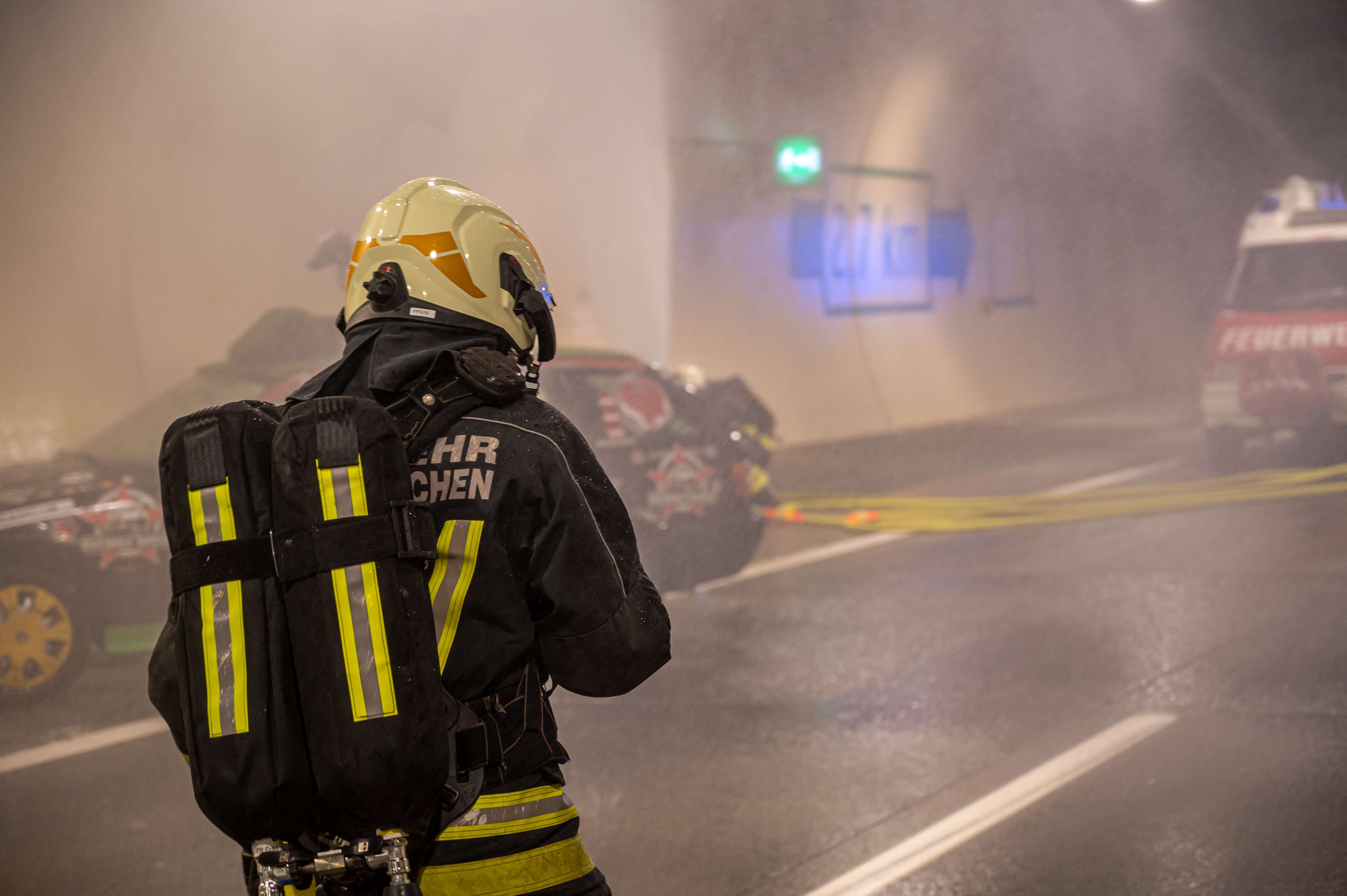 Unter schweren Atemschutz wurden dabei einzelne Trupps in das innere des Tunnels gebracht, wo sie den Brandeinsatz übten.