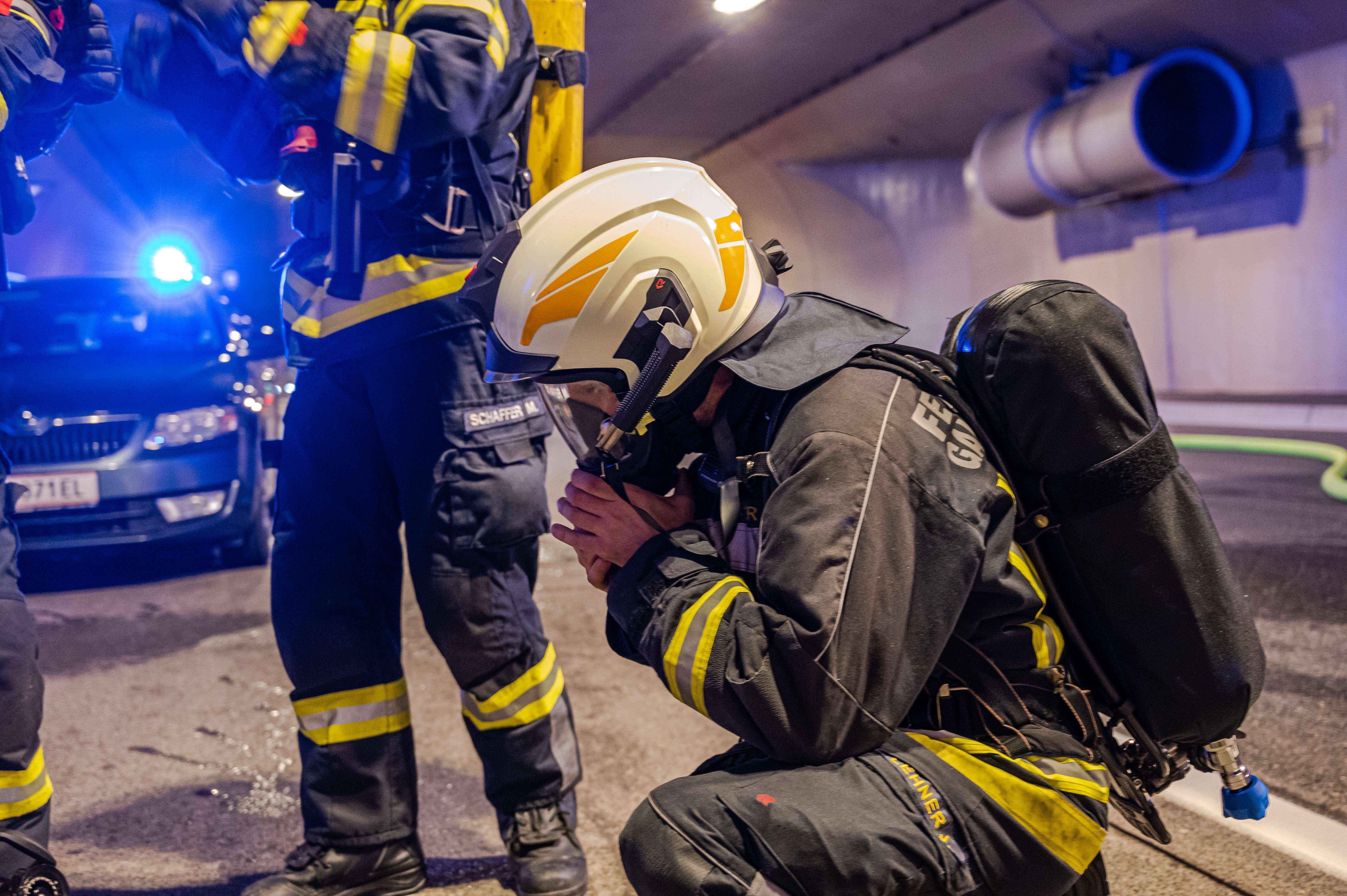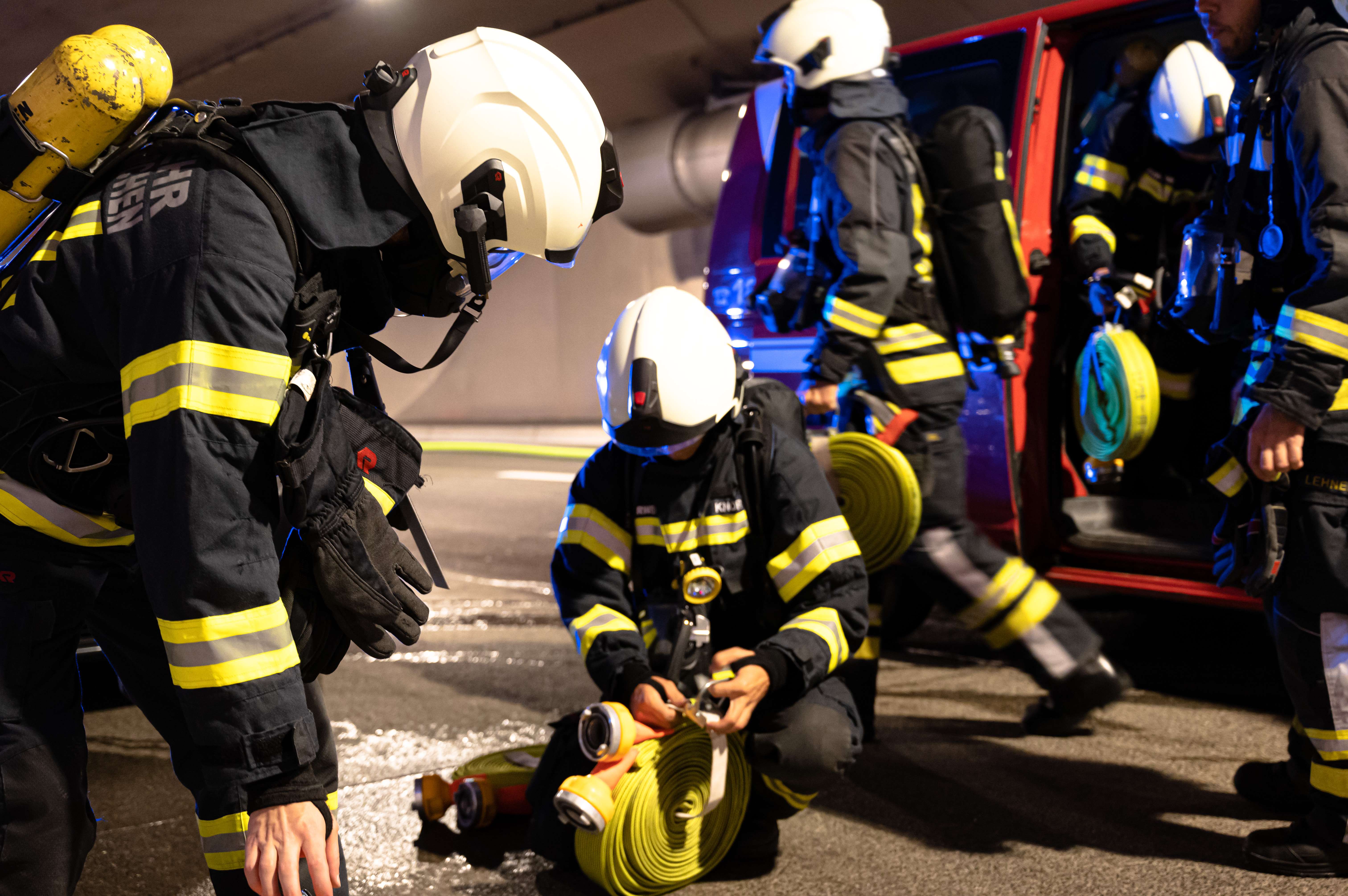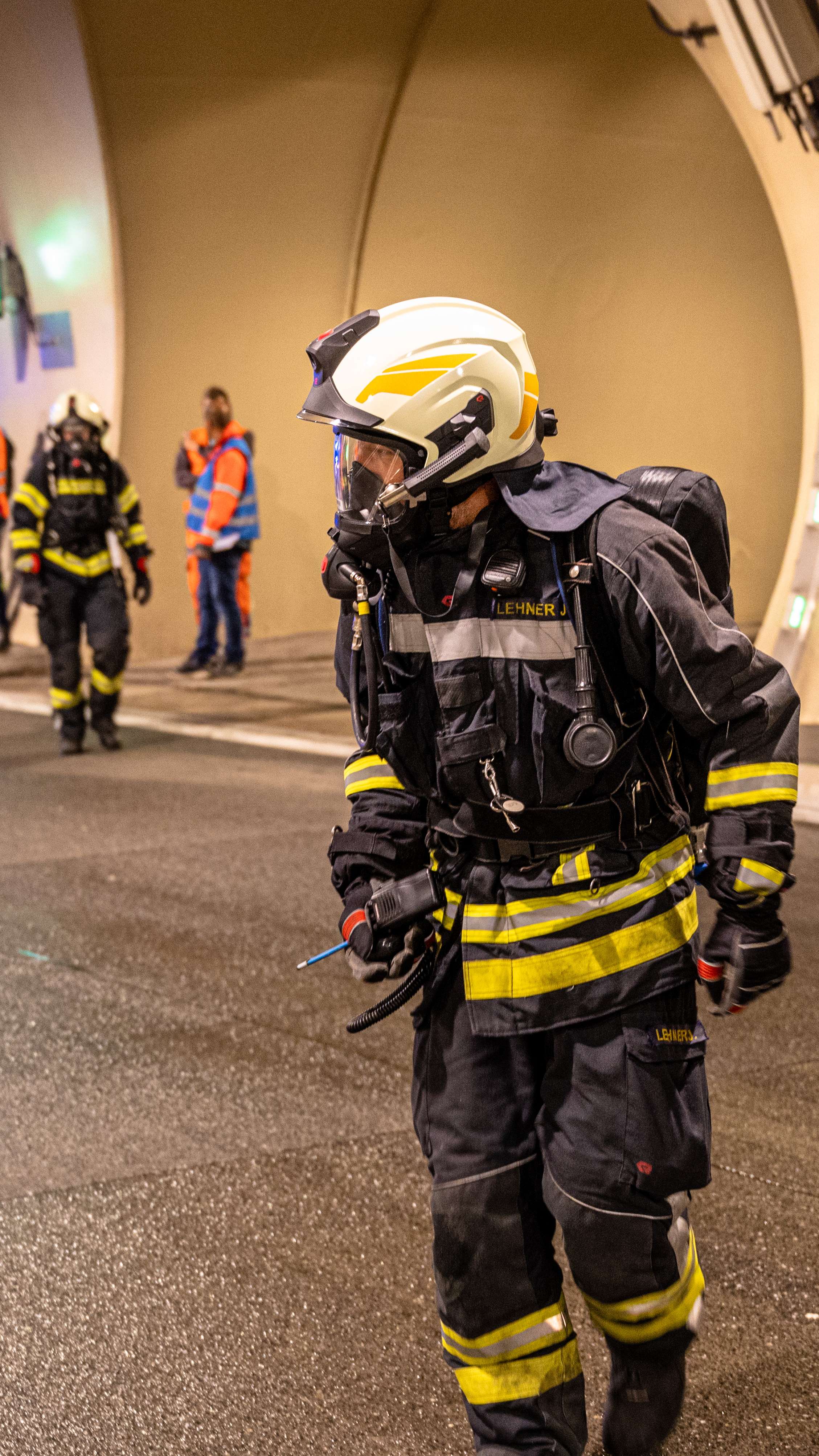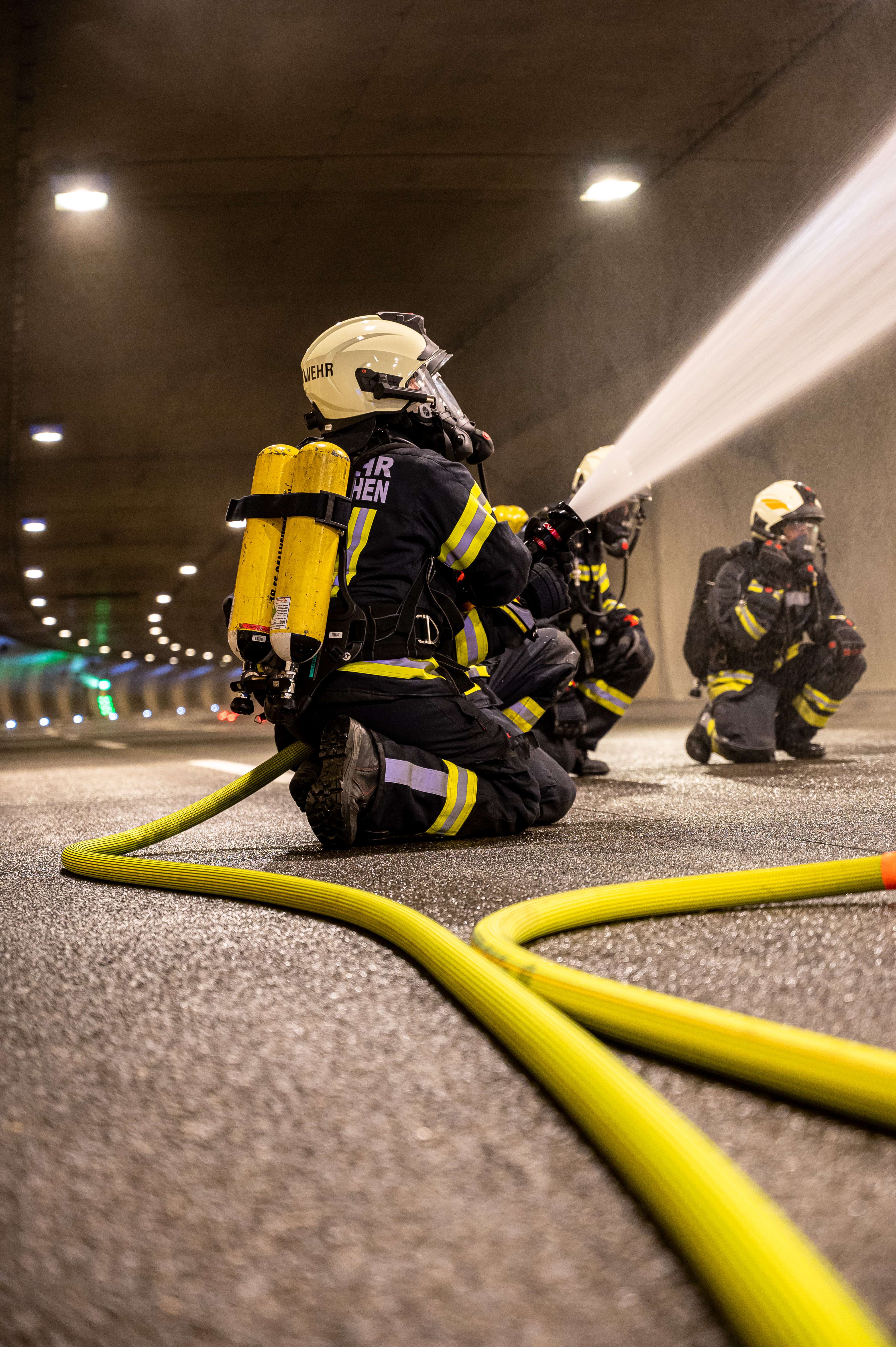 Unter schweren Atemschutz wurden dabei einzelne Trupps in das innere des Tunnels gebracht, wo sie den Brandeinsatz übten.