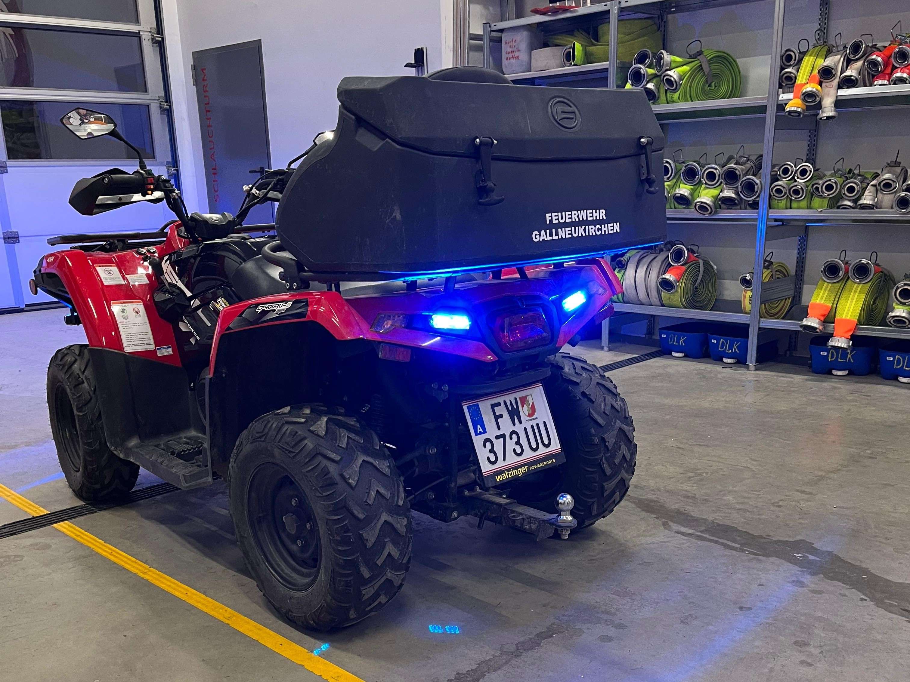 Sei es bei Waldbränden oder anderen Notfällen in schwer zugänglichem Gelände - dank innovativer Antriebstechnologie und etwa 30 PS kann jeder abgelegene Einsatzort rasch erreicht werden. Der verbaute lichtstarke Arbeitsscheinwerfer sorgt auch in der Nacht für gute Sicht. Die großräumige Heckbox bietet neben der Standardbeladung mit einem Notfalls-Sanitätsrucksack sowie einem Feuerlöscher noch Platz für weitere benötigte Gerätschaften.