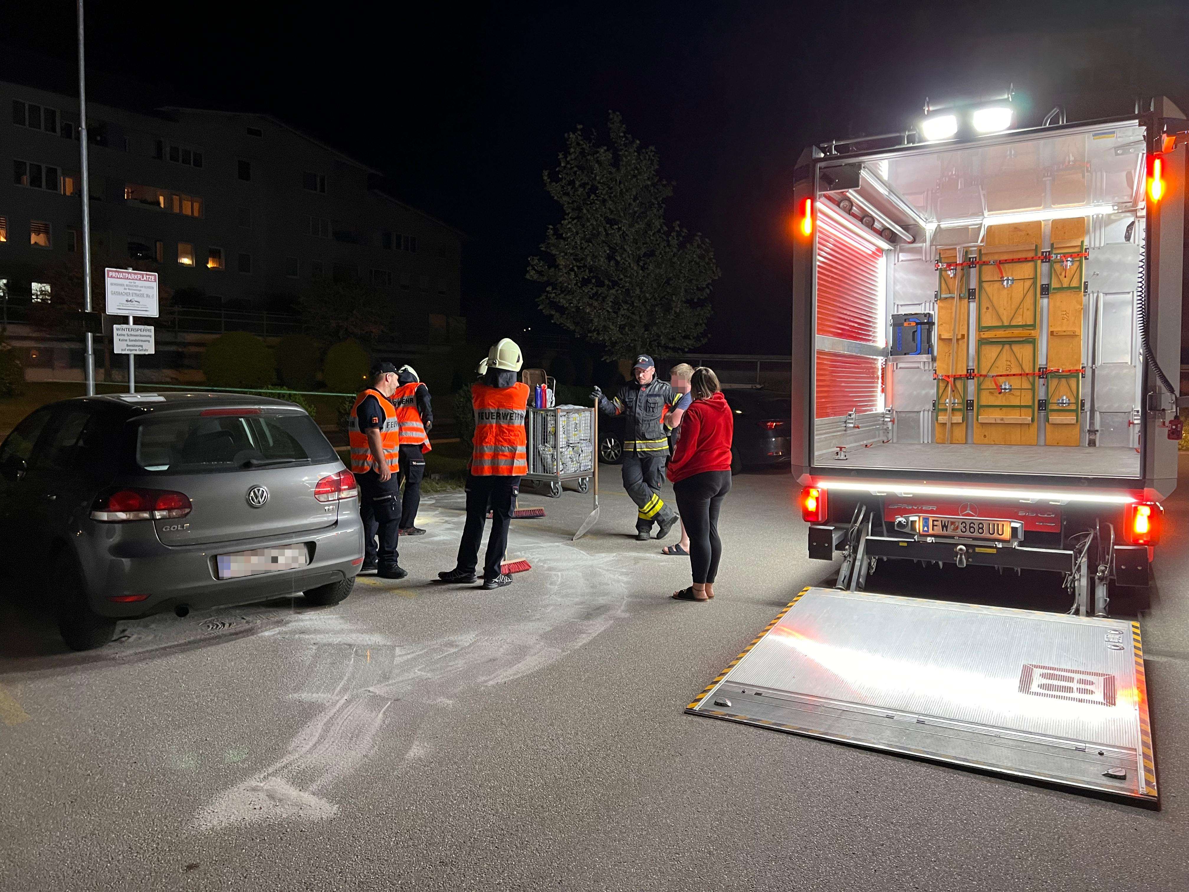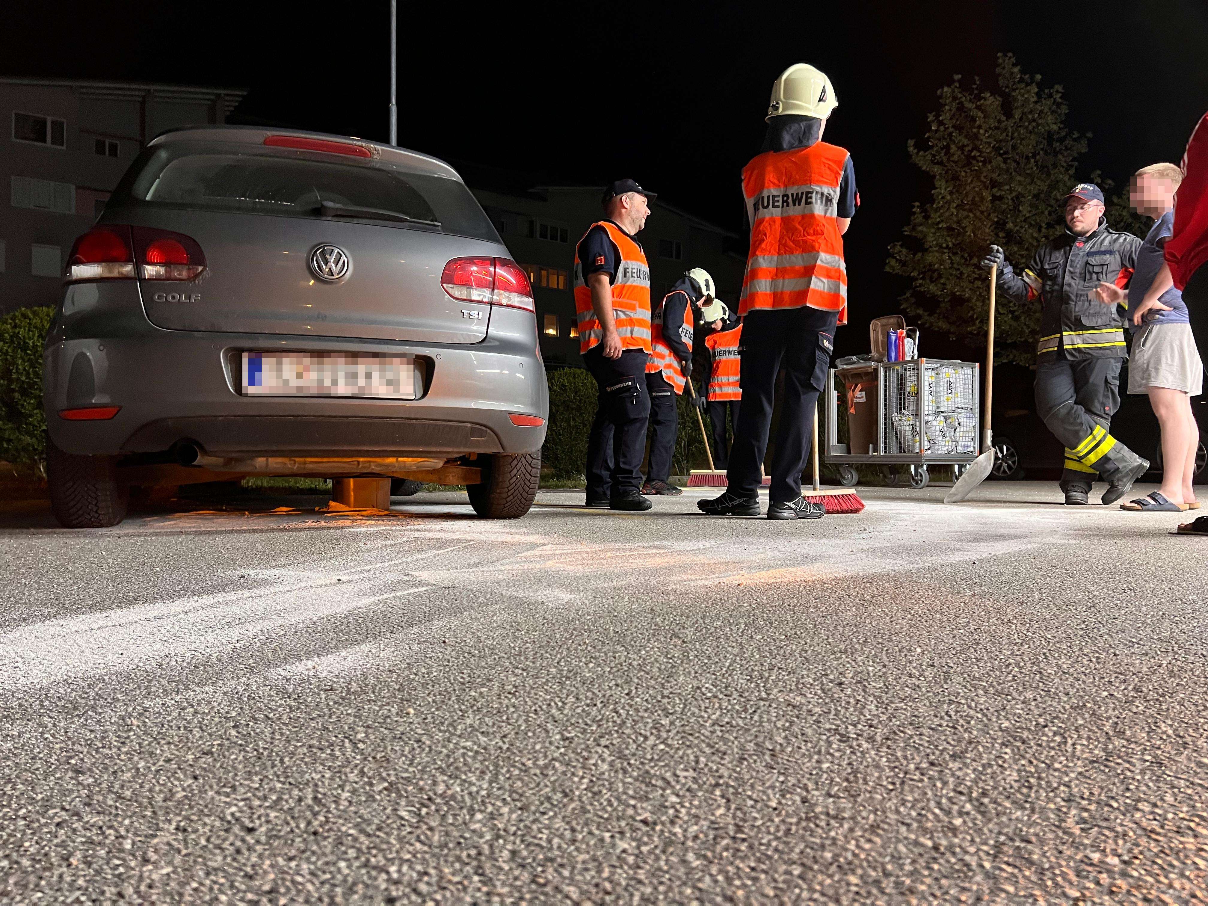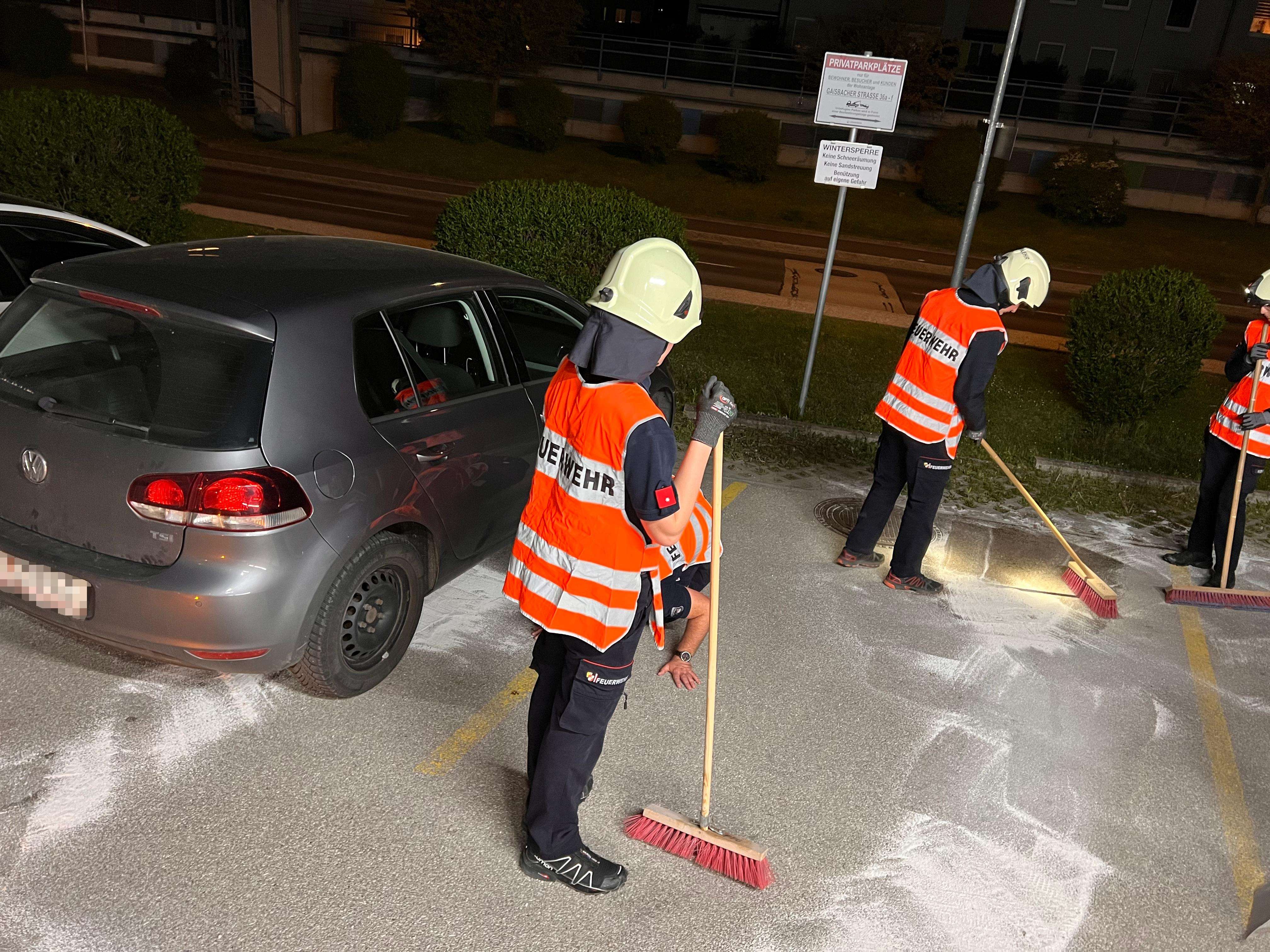 Ein auf einem Parkplatz abgestellter PKW verlor aufgrund eines technischen Defekts eine größere Menge an Betriebsmittel. Die Einsatzkräfte stoppten den Kraftstoffaustritt und banden das ausgetrete Benzin mithilfe von Ölbindemittel.