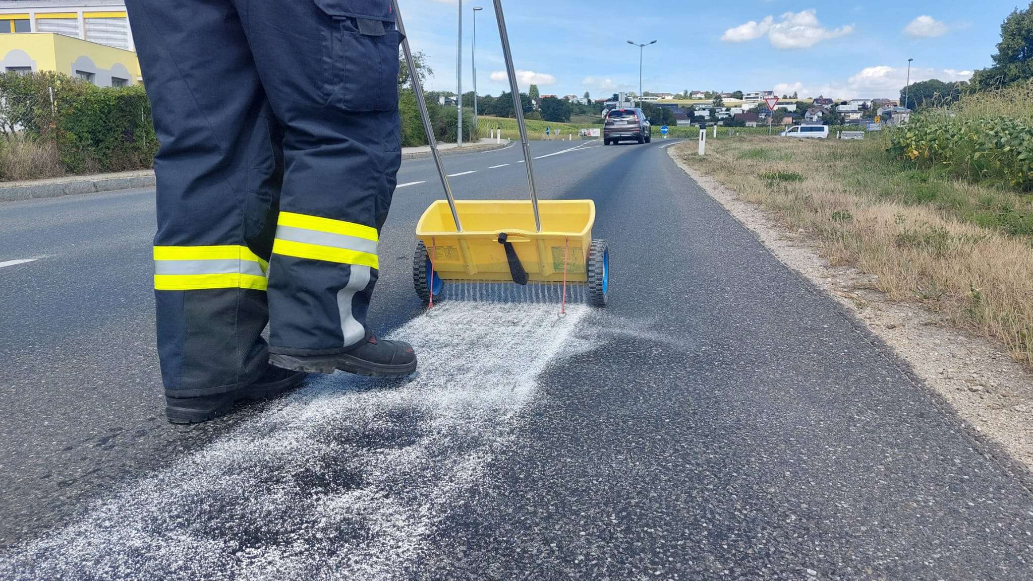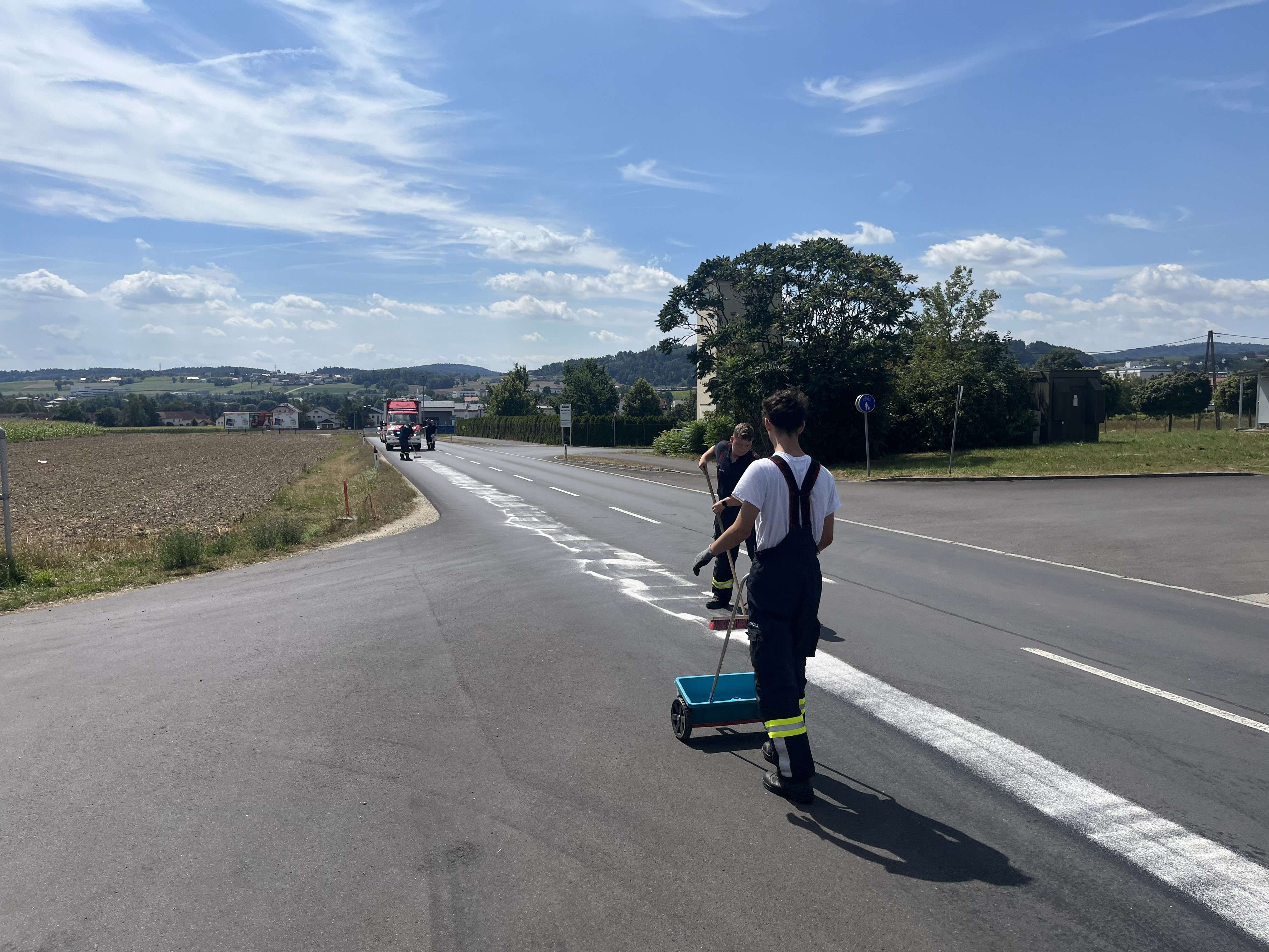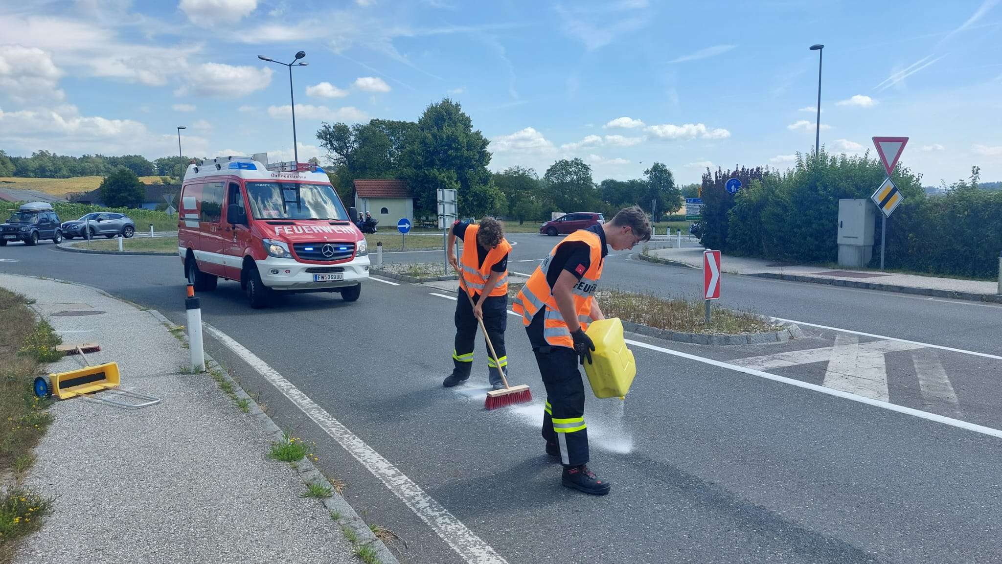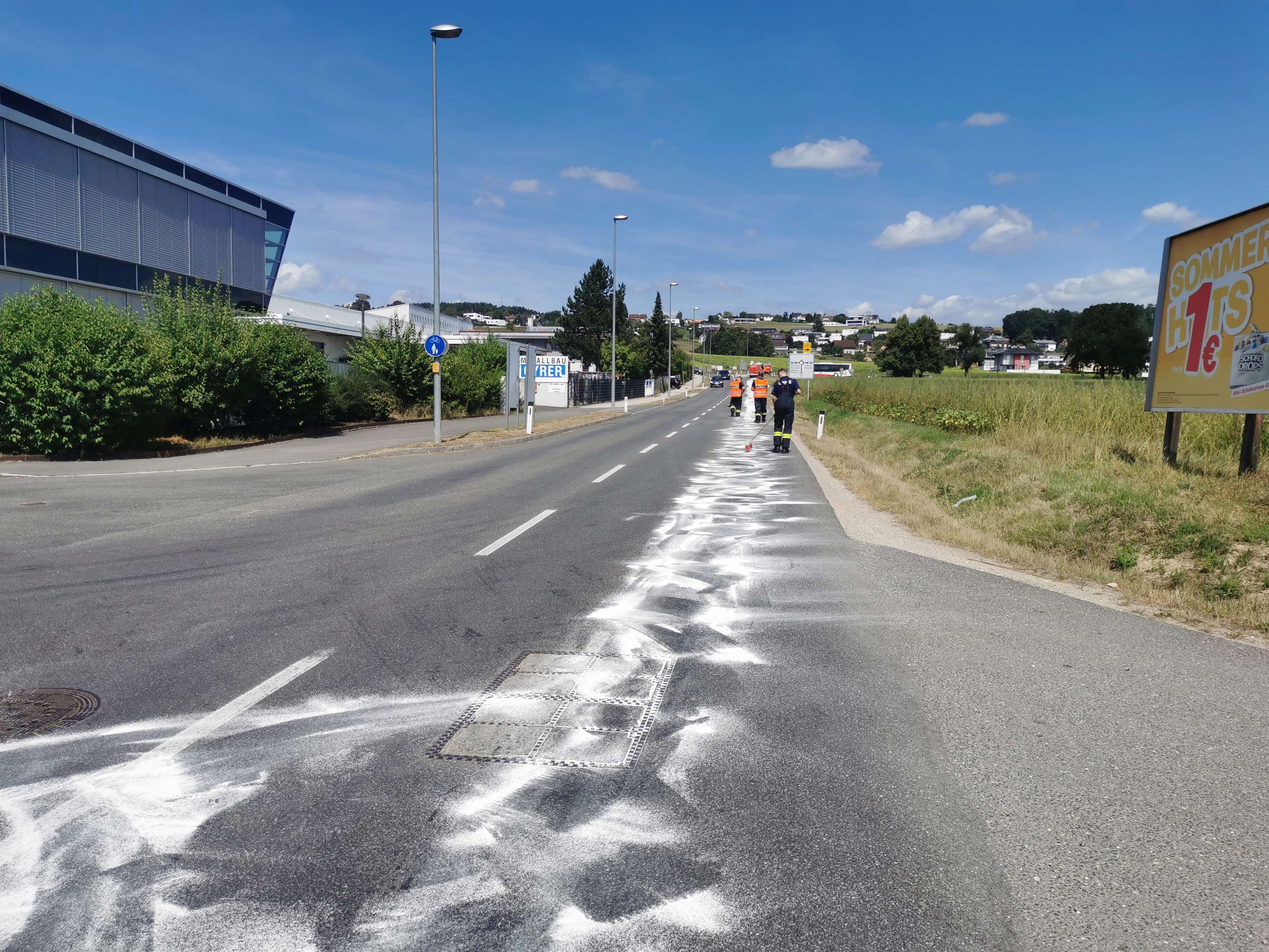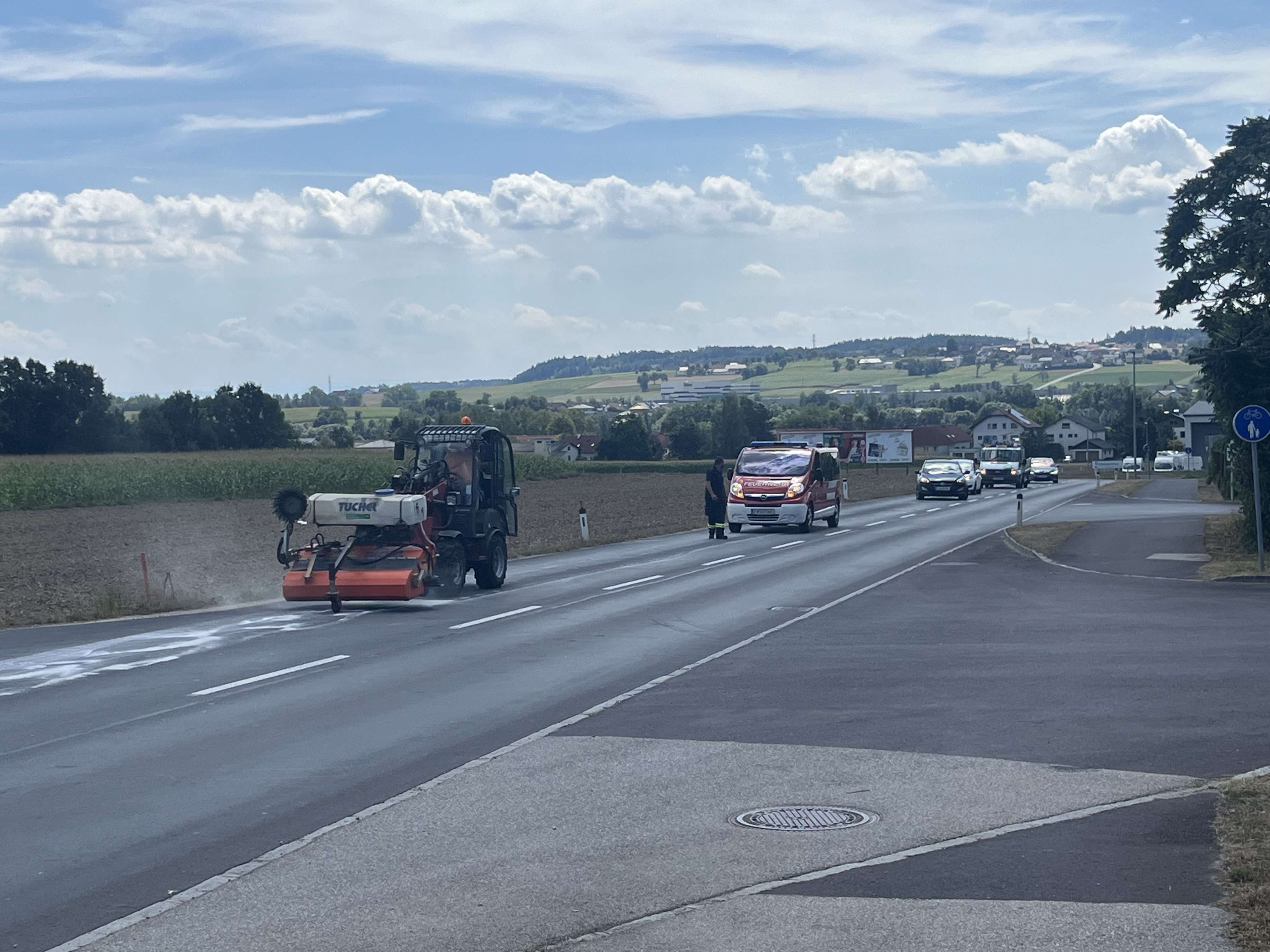 Aufgrund eines technischen Gebrechens war Kraftstoff aus einem Wohnmobil ausgetreten. Die Ölspur erstreckte sich vom Kreisverkehr Simmling durch das Ortsgebiet.
