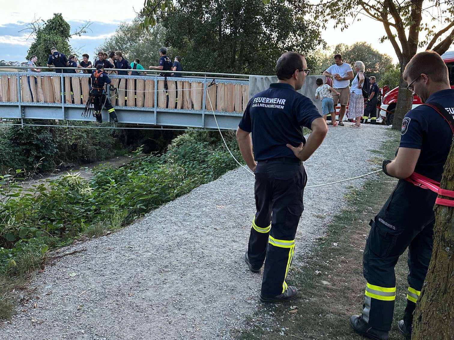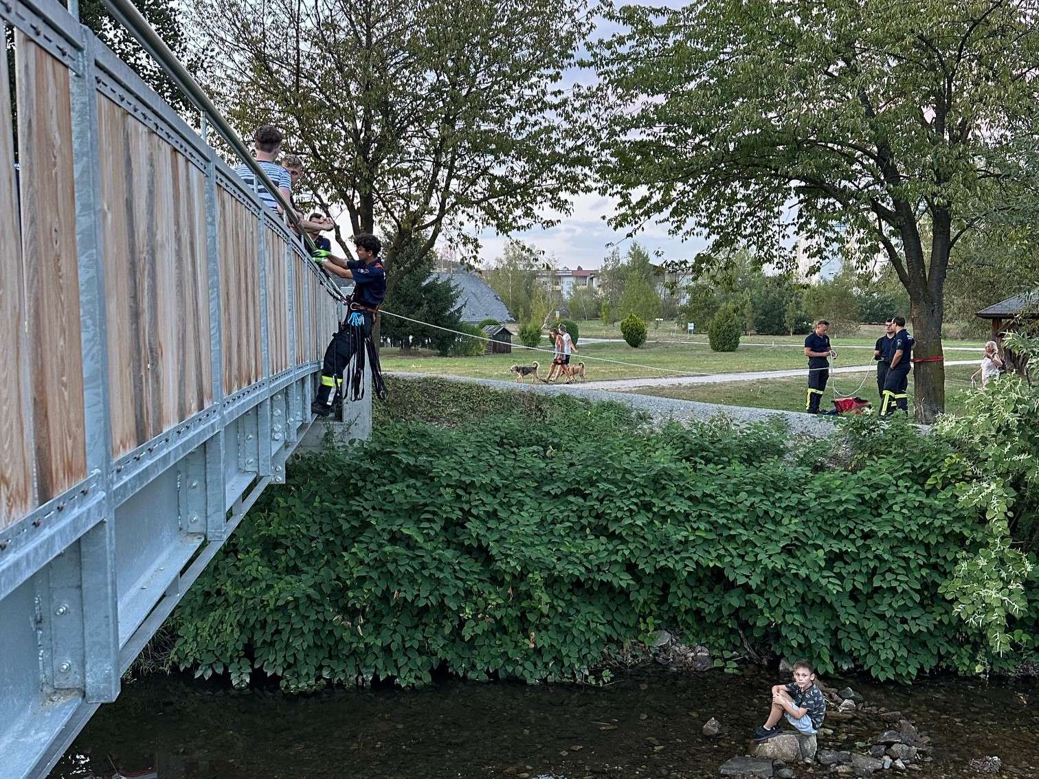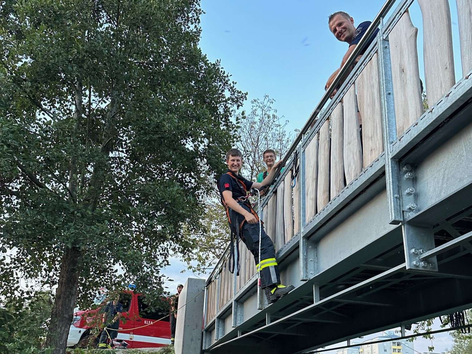 Mithilfe von Karabinern und Bandschlingen wurden beim Vorstoßen entlang der Brücke Sicherungspunkte geschaffen, sodass die kletternde Person mittels Seil vom Ufer aus gesichert werden konnte.