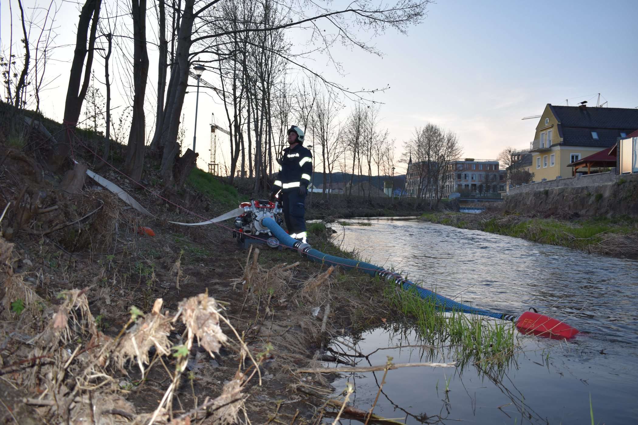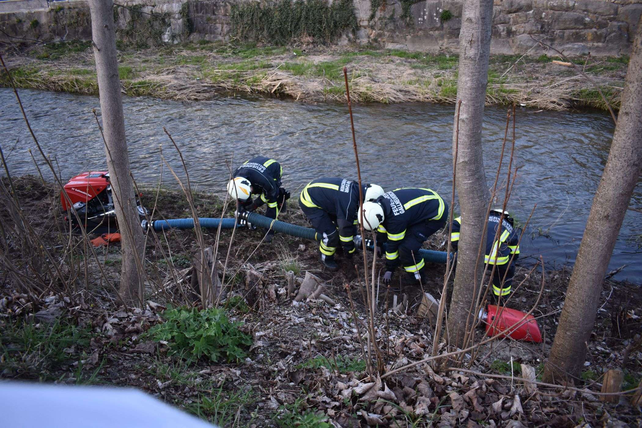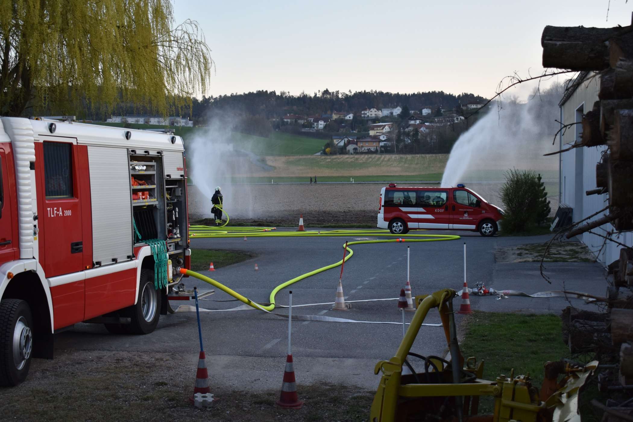 Die Kameraden trafen an der Einsatzstelle ein. Hier fanden sie den Traktor nach einer Überhitzung brennend im Feld vor. Die Besatzung des TLF begann einen Schnellangriff aufzubauen um damit erste Löschversuche zu übernehmen. Währenddessen baute die Besatzung des KLF die Wasserzufuhr von der benachbarten Gusen auf. Mit dieser wurde die Pumpe des TLF gespeist.
