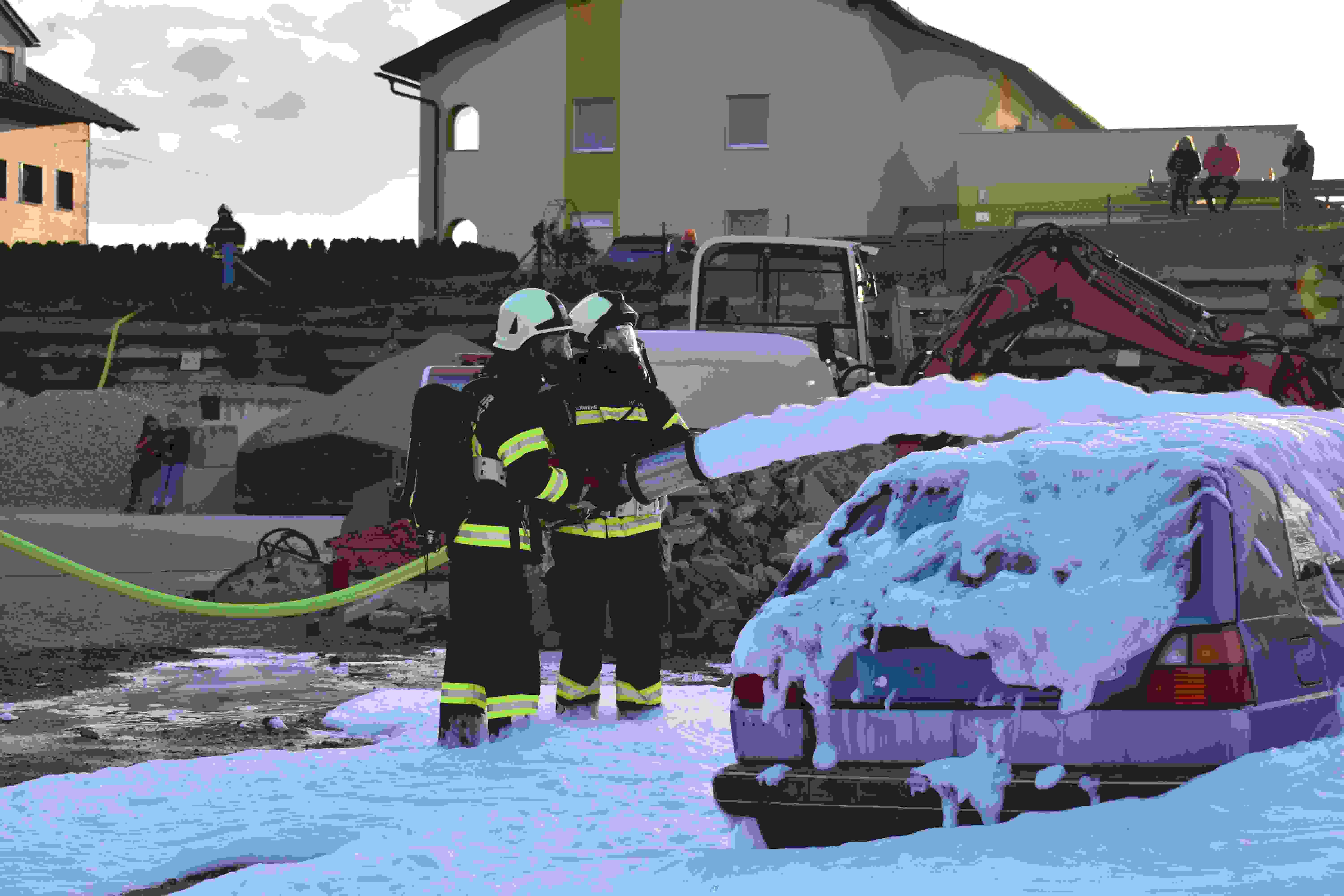 Die eintreffenden Einsatzkräfte waren mit einem brennenden KFZ, welches gegen einen Transformator gefahren war, konfrontiert. Die Besatzung der drei eintreffen den Fahrzeuge begann mittels Schaum-Schnellangriff die Flammen zu bekämpfen. Zusätzlich sicherten sie auch noch die Wasserversorgung des Tanklöschfahrzeuges mittels einer Zubringerleitung von einem nahe gelegenen Hydranten. Der Brand konnte schnell bekämpft und die Übung beendet werden.