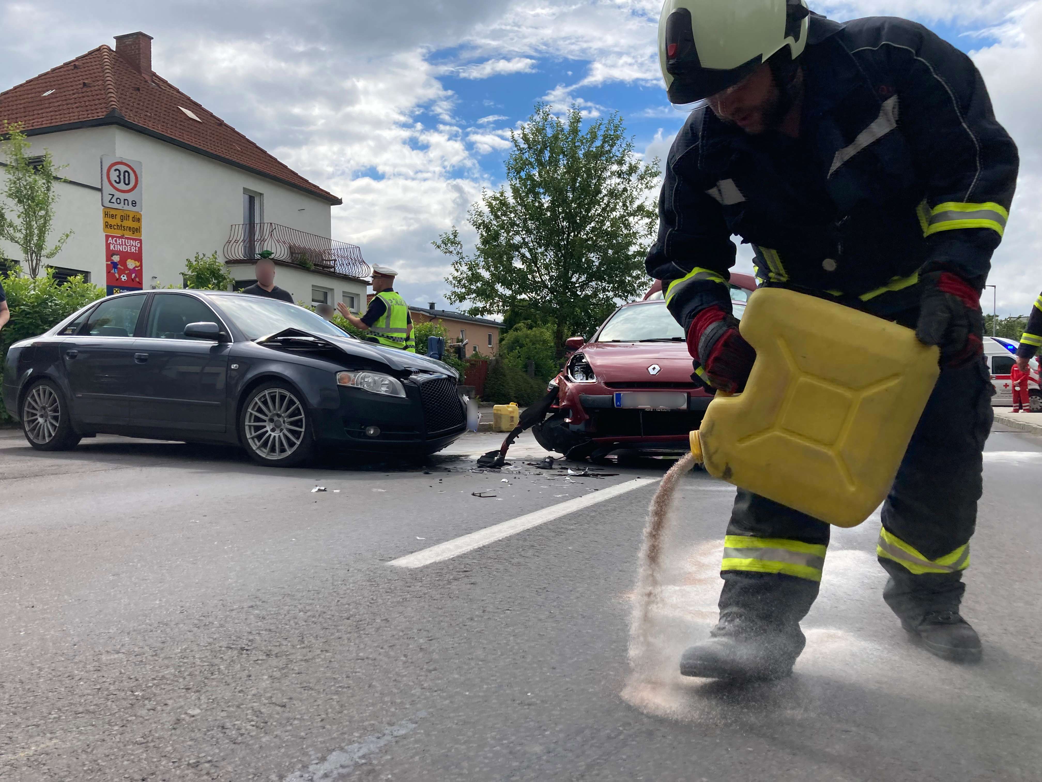 Nach der Unfallaufnahme durch die Polizei konnten die Einsatzkräfte der Feuerwehr die Straße von den ausgelaufenen Betriebsmitteln rasch reinigen.