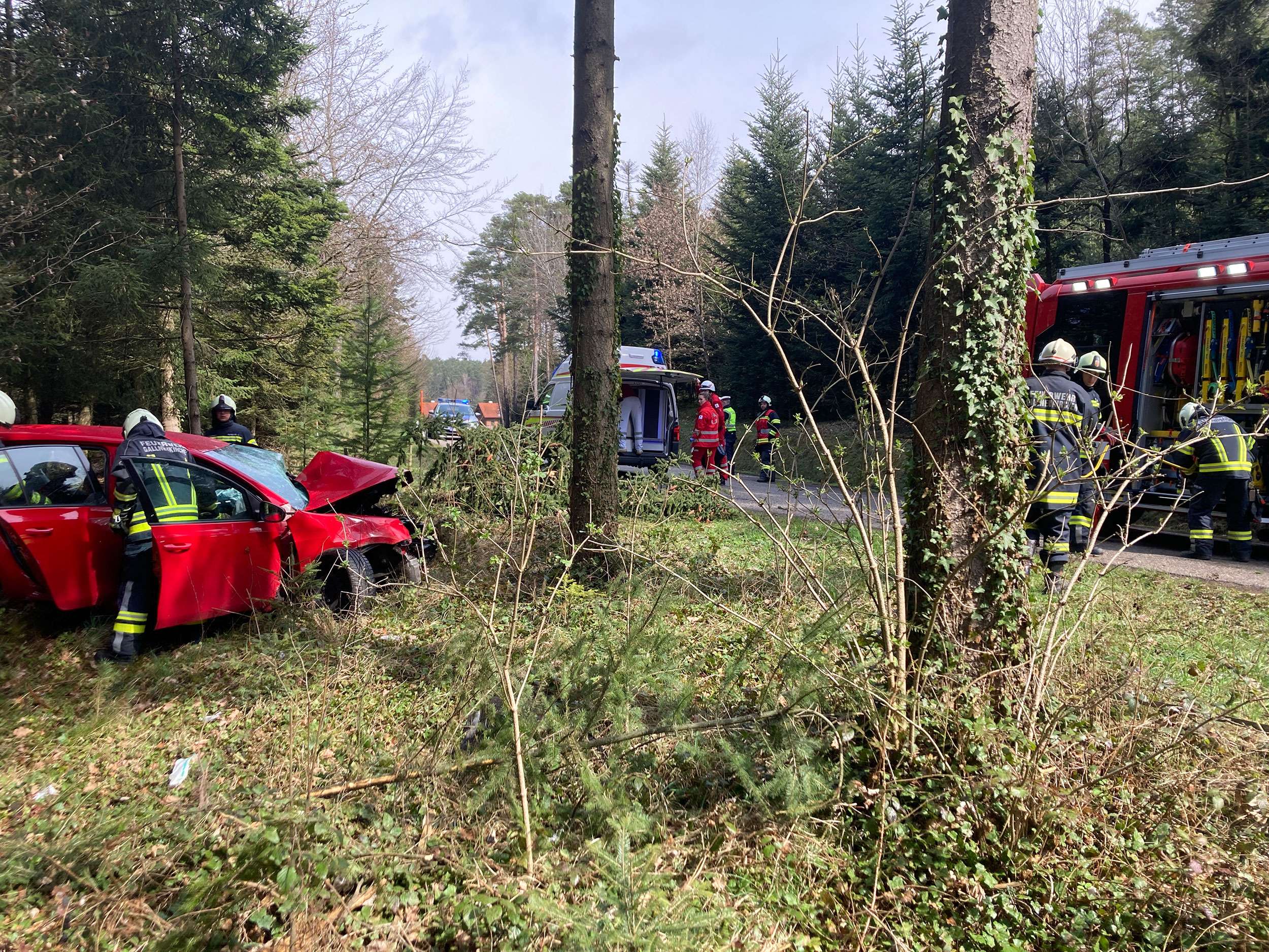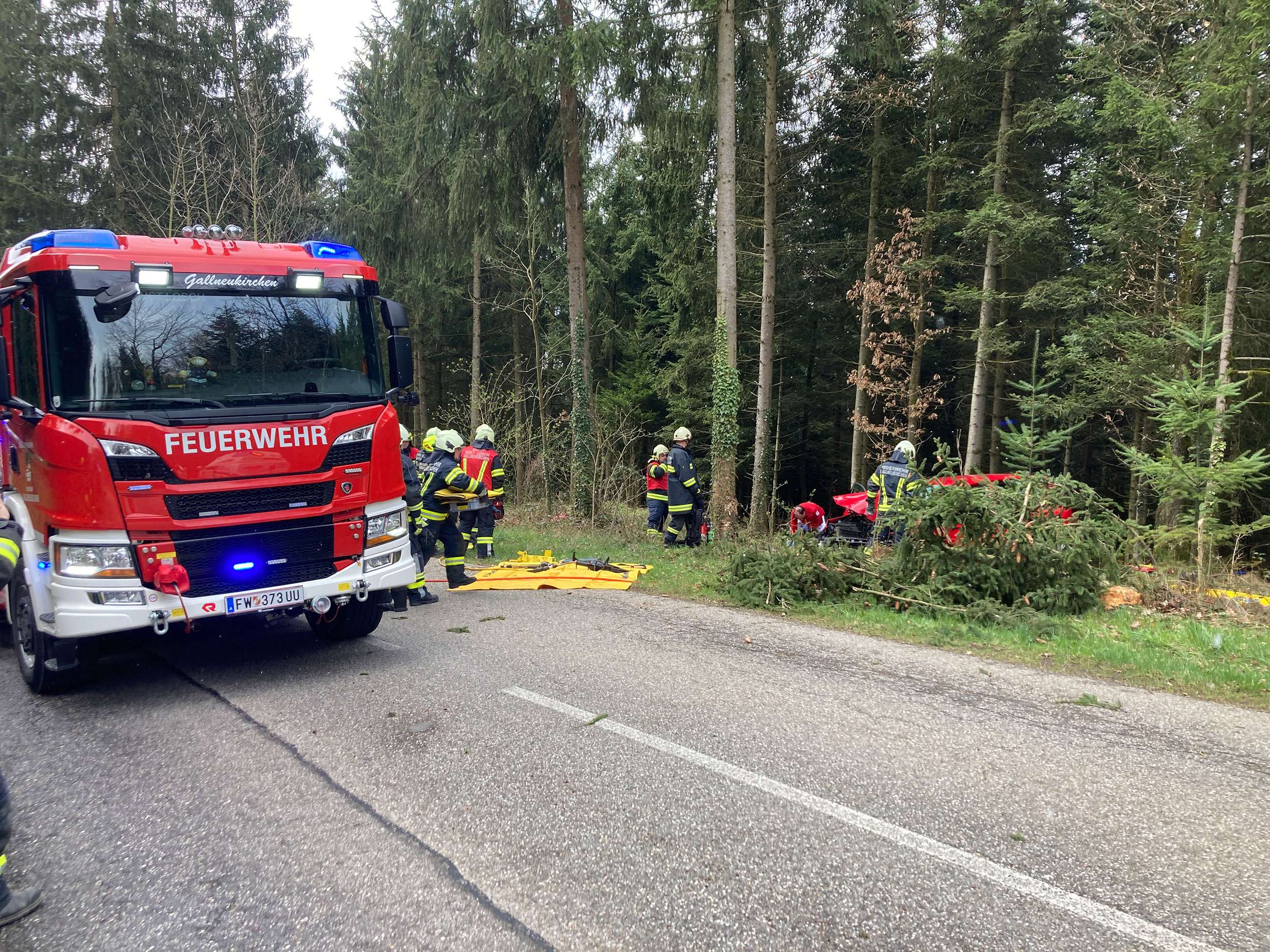 Am heutigen Dienstag um 11:57 Uhr wurden die Feuerwehren Schweinbach und Gallneukirchen zu einem Verkehrsunfall auf der Alberndorfer Straße zwischen Gallneukirchen und Almesberg gerufen. Ein Autofahrer kam aus bisher ungeklärter Ursache von der Fahrbahn ab und landete im nahegelegenen Waldstück. Die Person war in ihrem Wagen eingeklemmt und konnte das Fahrzeug nicht selbstständig verlassen.