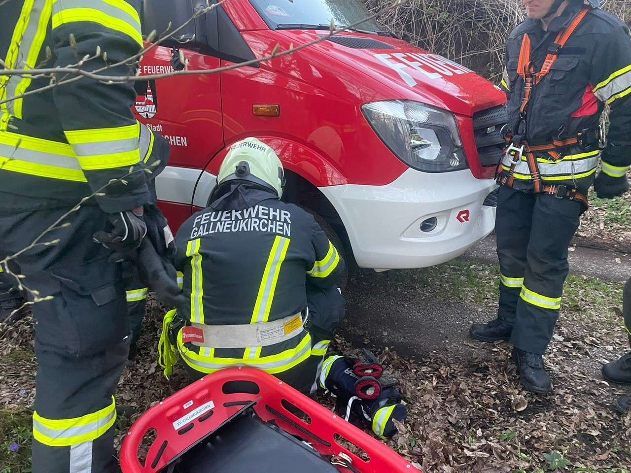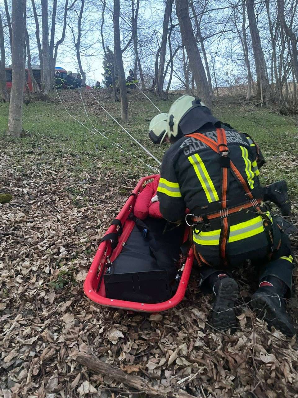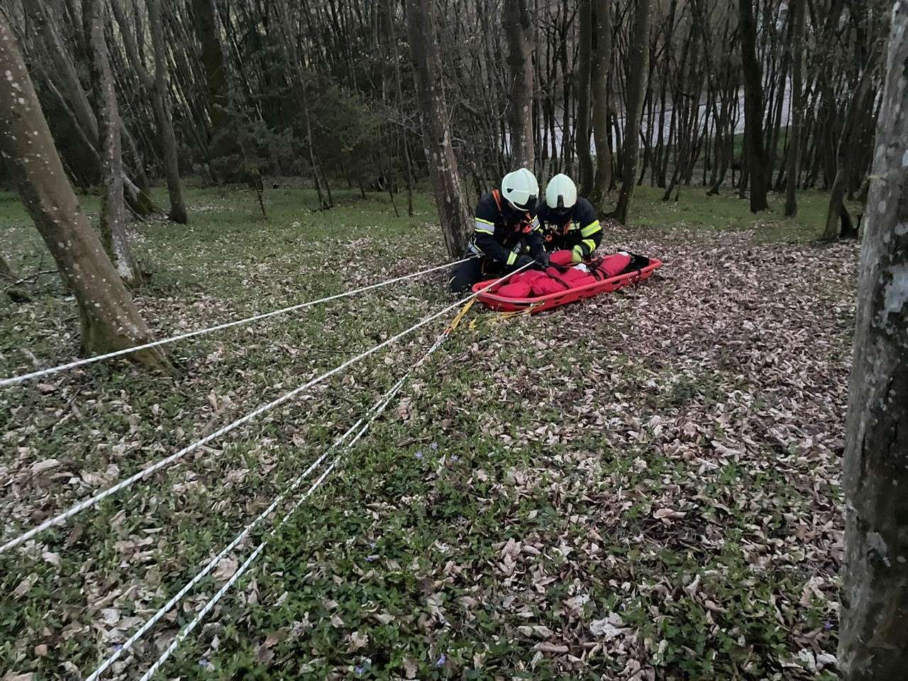 Mittels Korbschleiftrage wurde eine vermeintlich verletzte Person aus dem Steilgelände beim Schloss Riedegg gerettet.