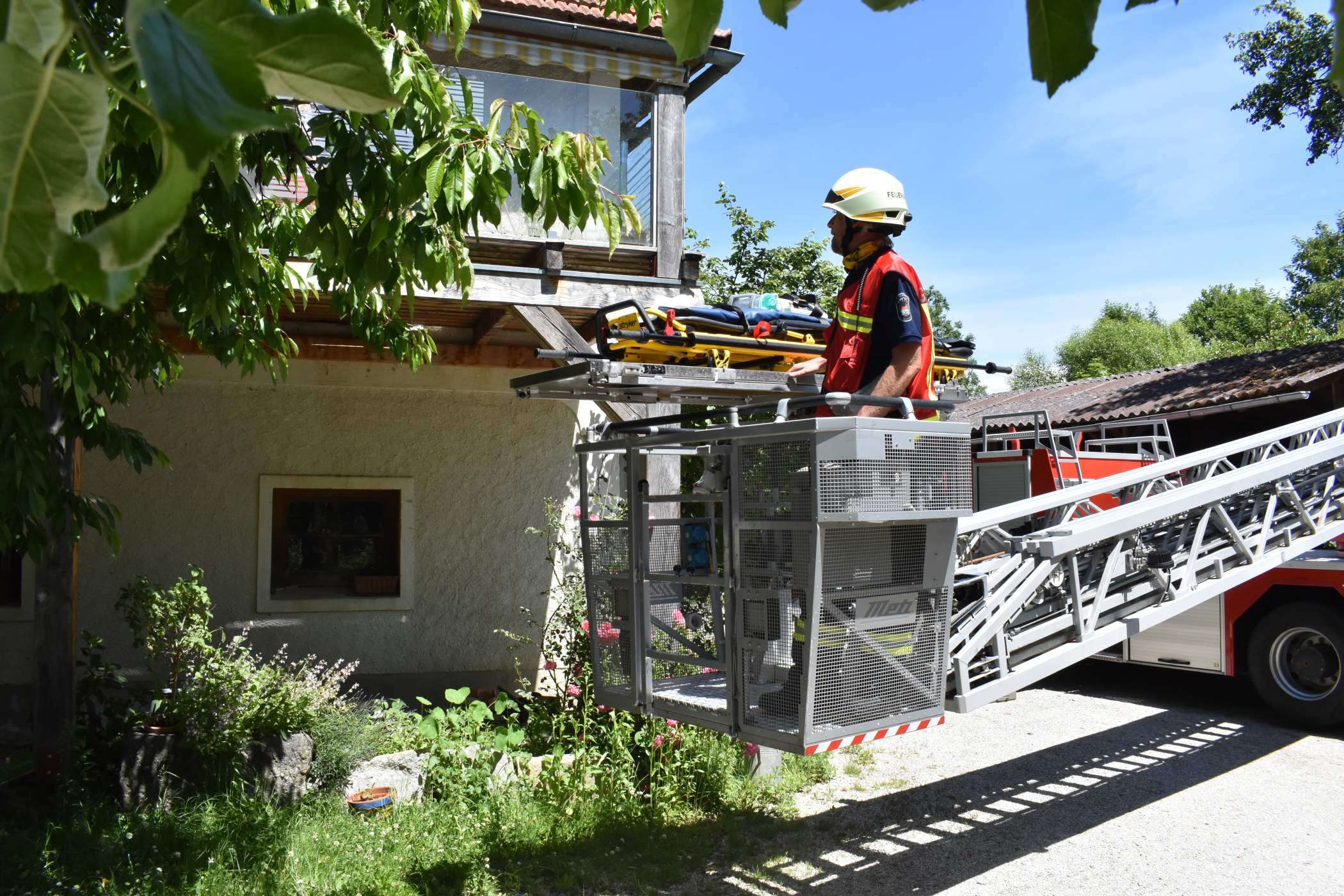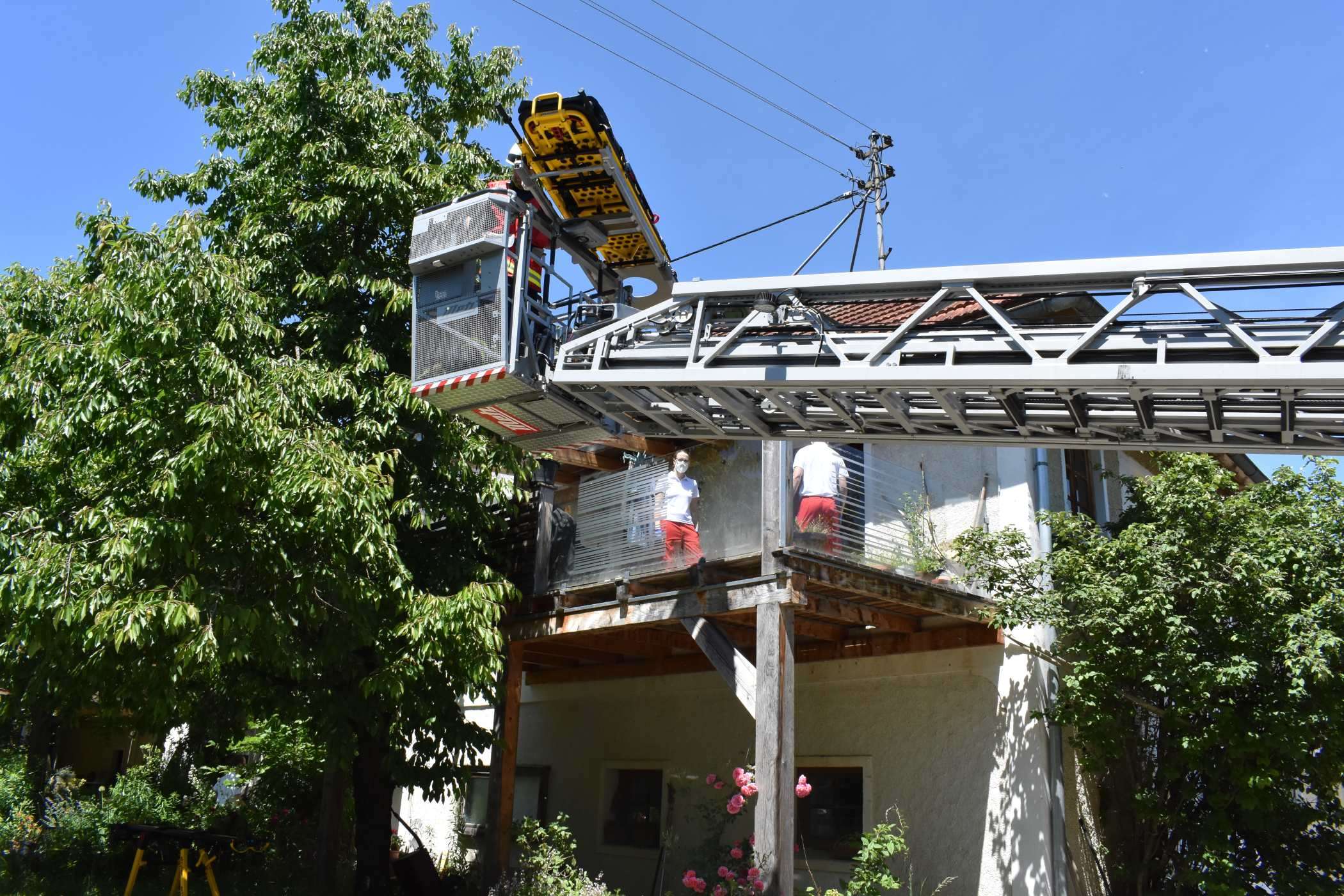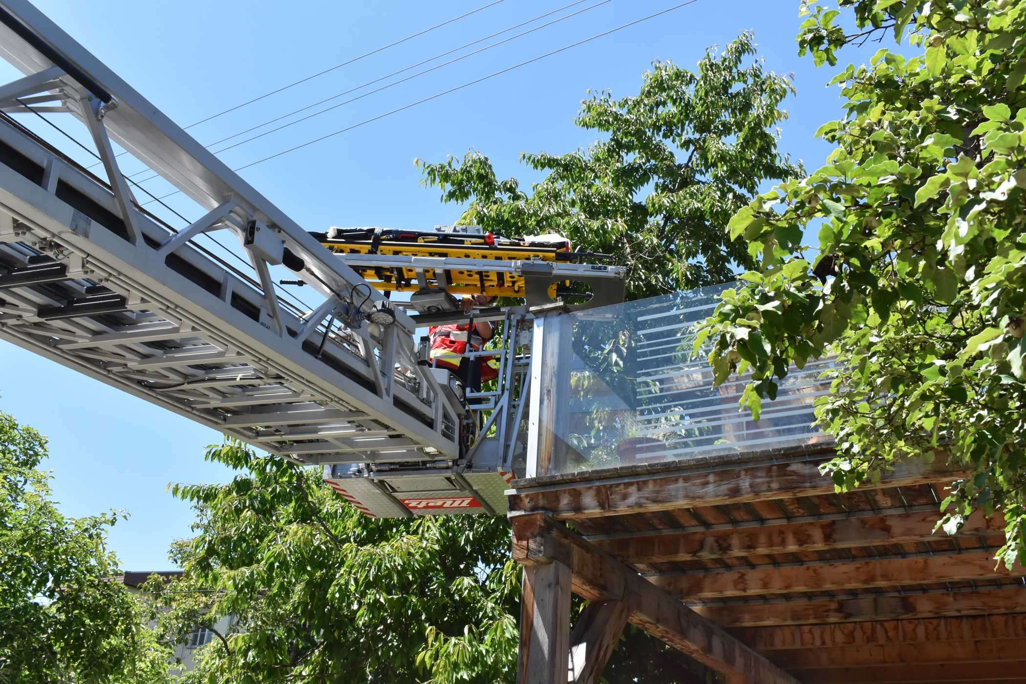 Deshalb forderte die Rettung unsere Drehleiter zur schonenden Rettung des Patienten an, die dann über den Balkon erfolge.