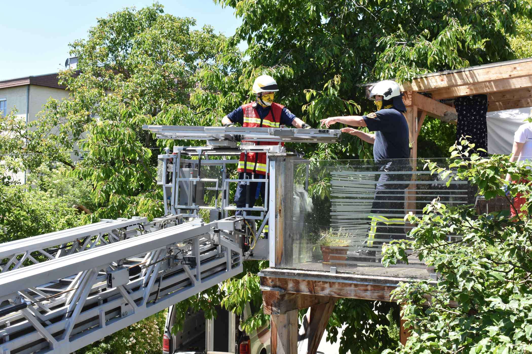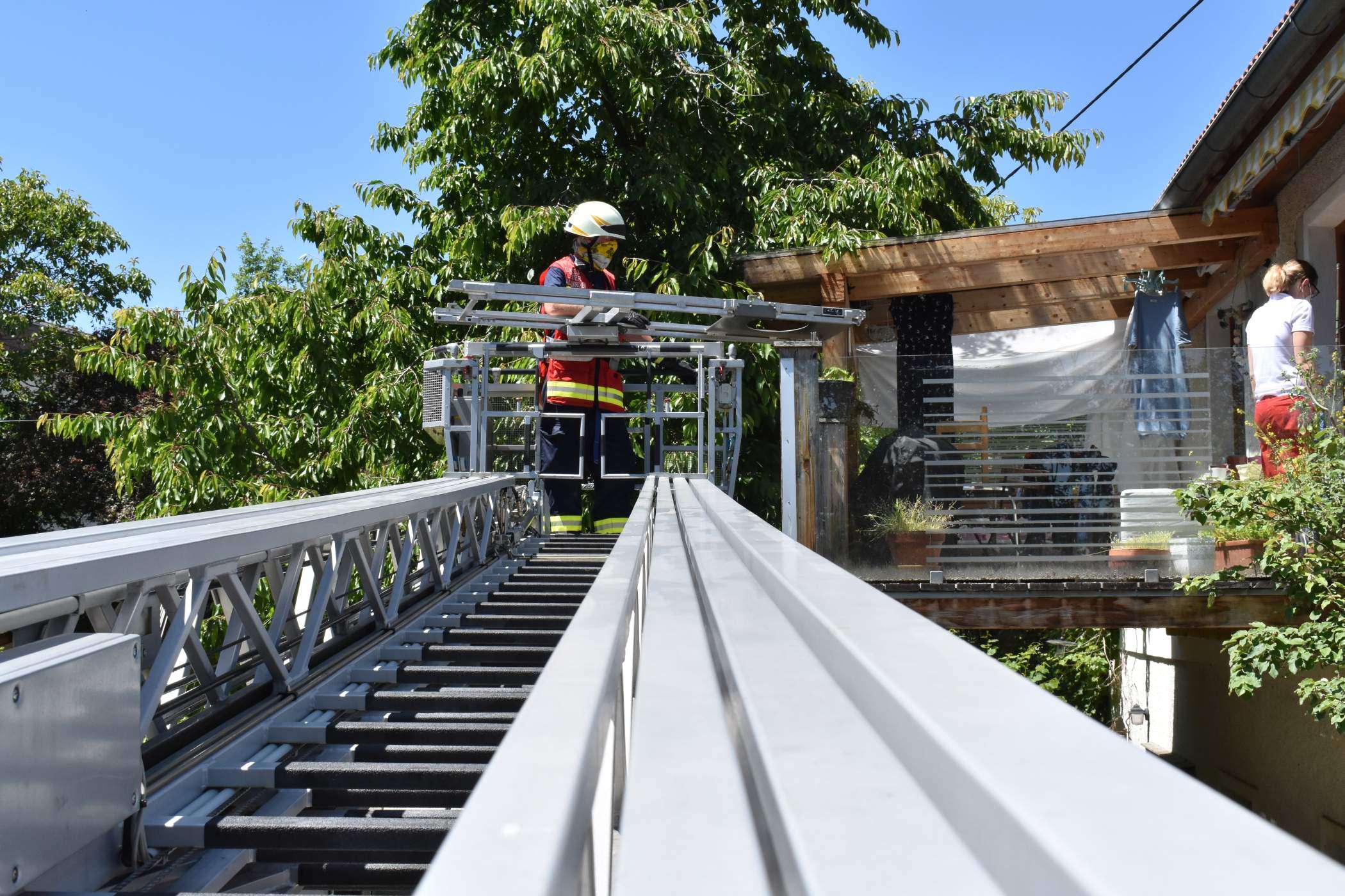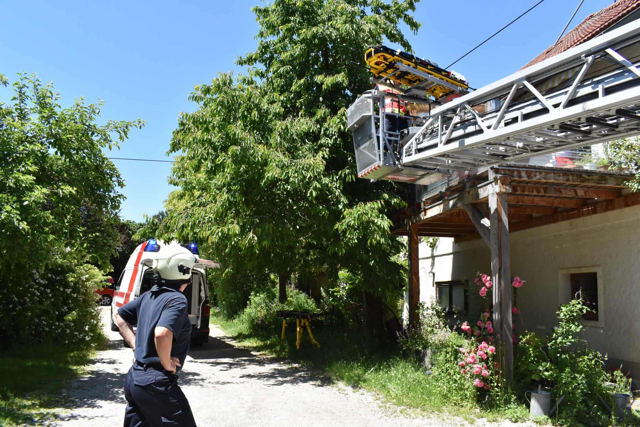 Deshalb forderte die Rettung unsere Drehleiter zur schonenden Rettung des Patienten an, die dann über den Balkon erfolge.