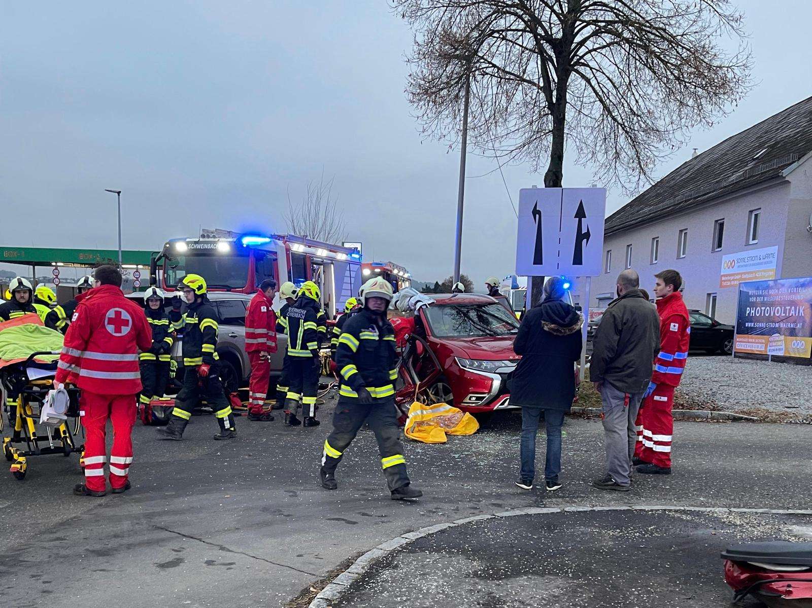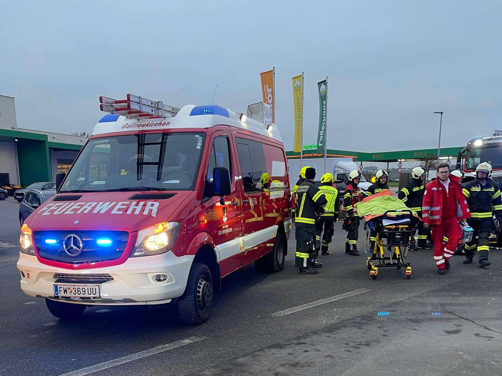 Beim Eintreffen am Einsatzort zeigte sich, dass eine Person im Unfallfahrzeug eingeschlossen war. Die technische Menschenrettung wurde durch die Feuerwehr Schweinbach durchgeführt. Parallel dazu unterstützten die Einsatzkräfte der Feuerwehr Gallneukirchen unter anderem durch das Aufbauen des Brandschutzes sowie das Vorbereiten und Errichten der Breitstellungsplane.