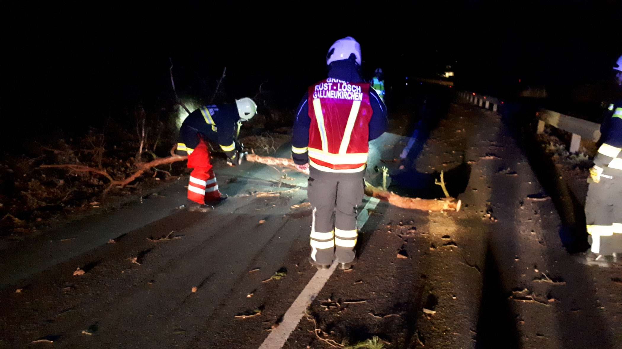Kaum im Feuerwehrhaus angekommen, wurden wir von der Landeswarnzentrale zu mehreren umgestürzten Bäume gerufen, welche die Straße blockierten.
