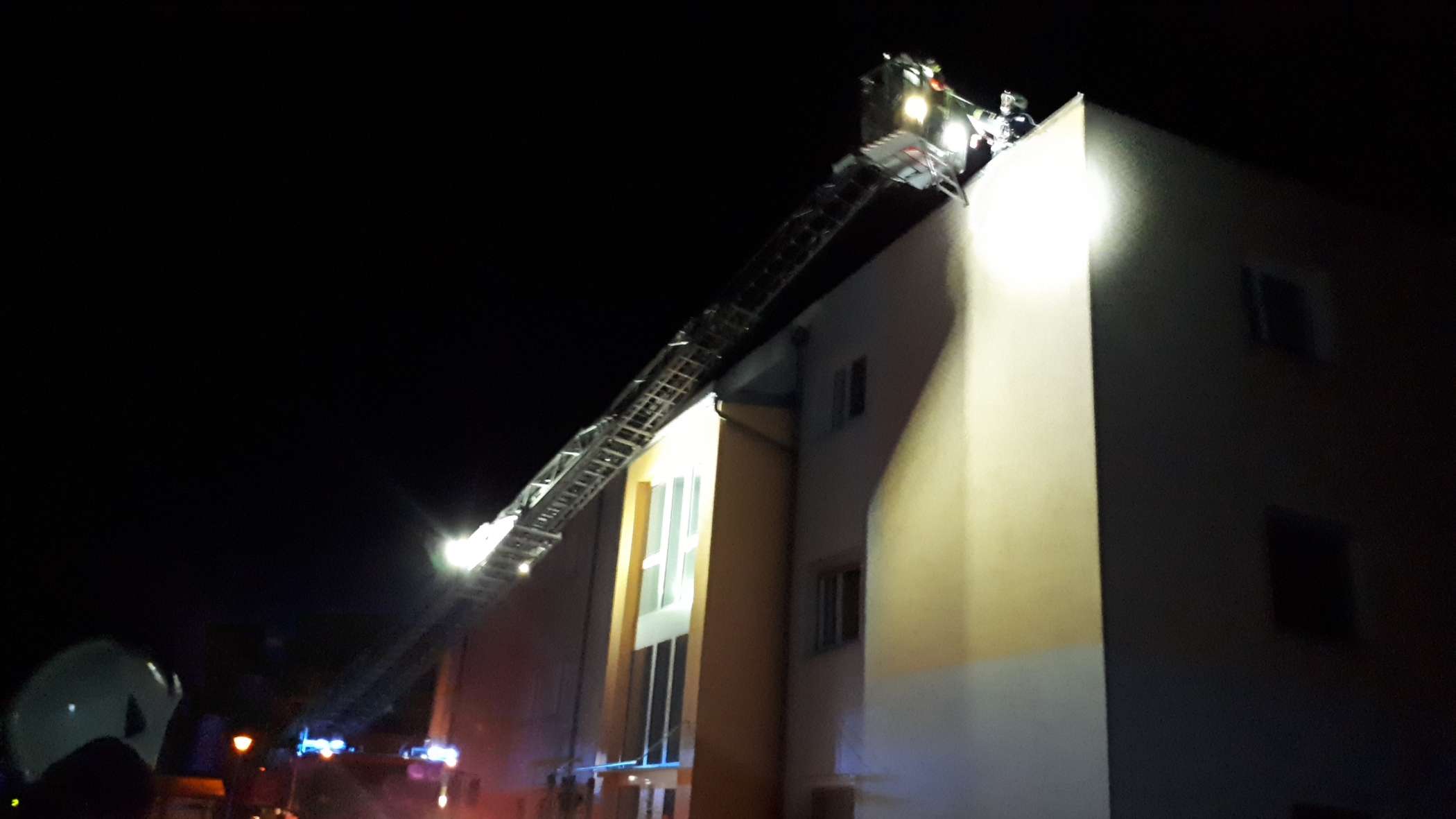 Um 20:08 Uhr wurden wir zum ersten Einsatz gerufen. Anwohner bemerkten, dass sich vom Nachbarhaus ein Blechstück des Daches löste und zu Boden stürzte. Die Kameraden konnten mittels Drehleiter die restlichen unbefestigten Bleche entfernen und wieder einrücken.
